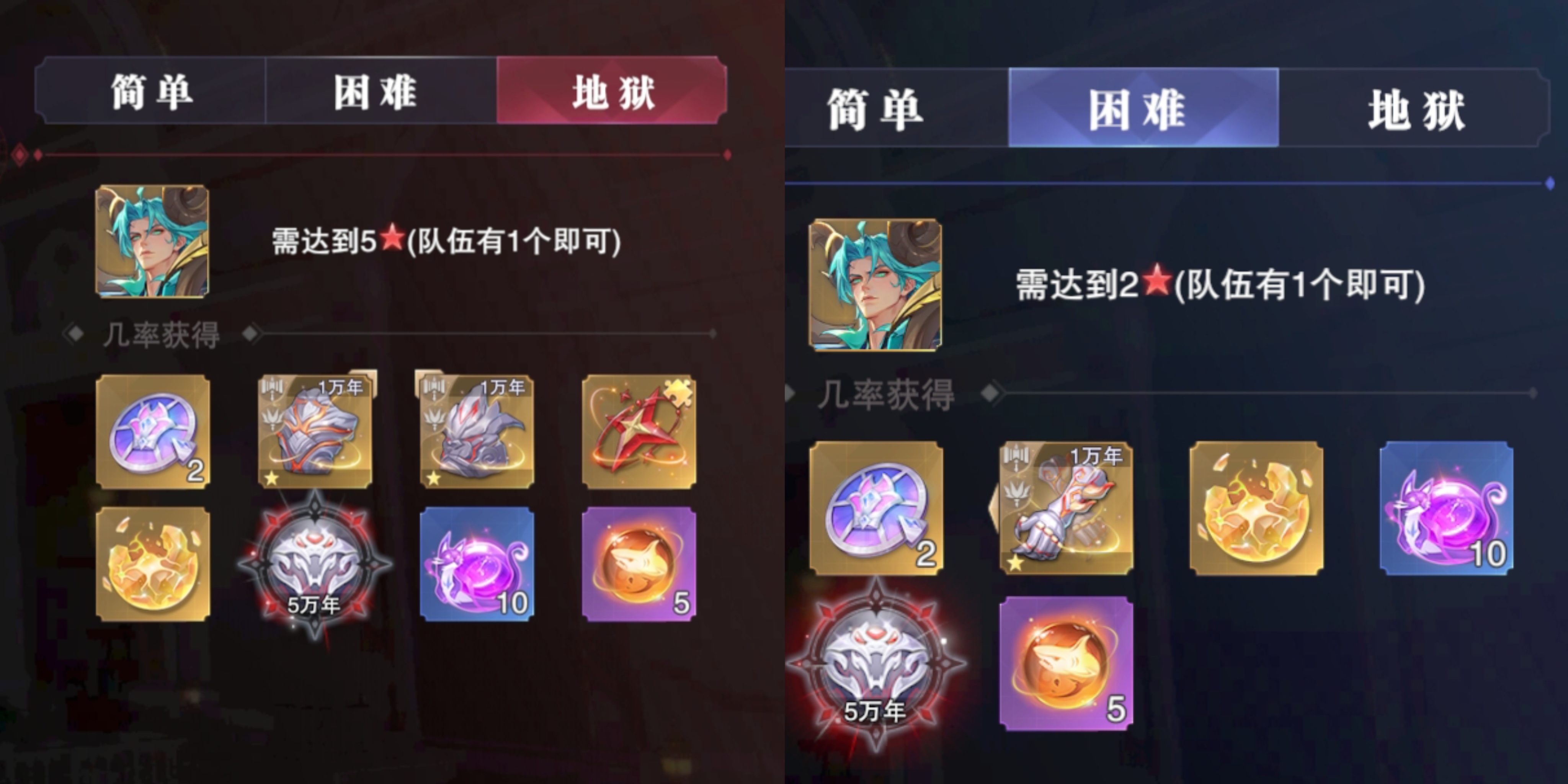 ②地狱模式需要红5星的【天青牛蟒】,每天可挑战2次。