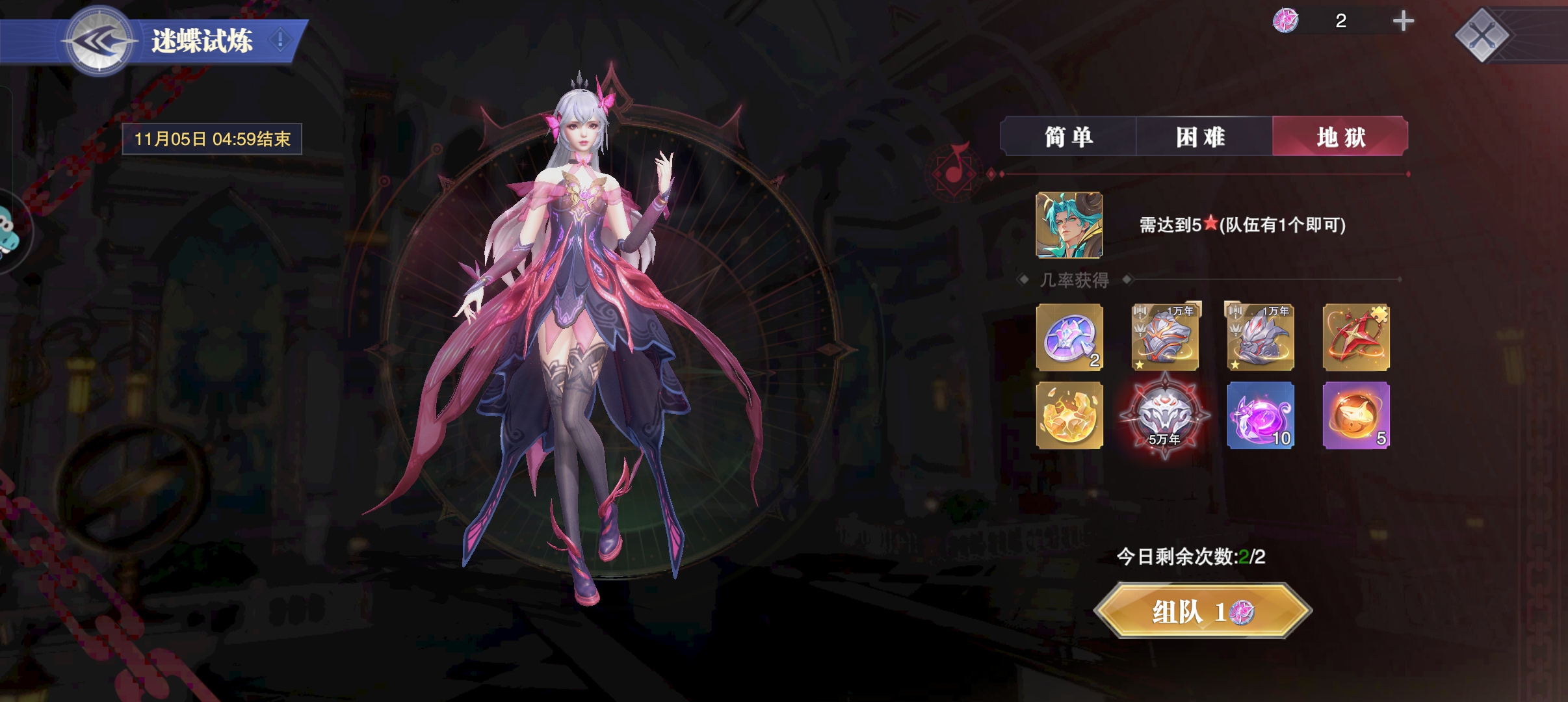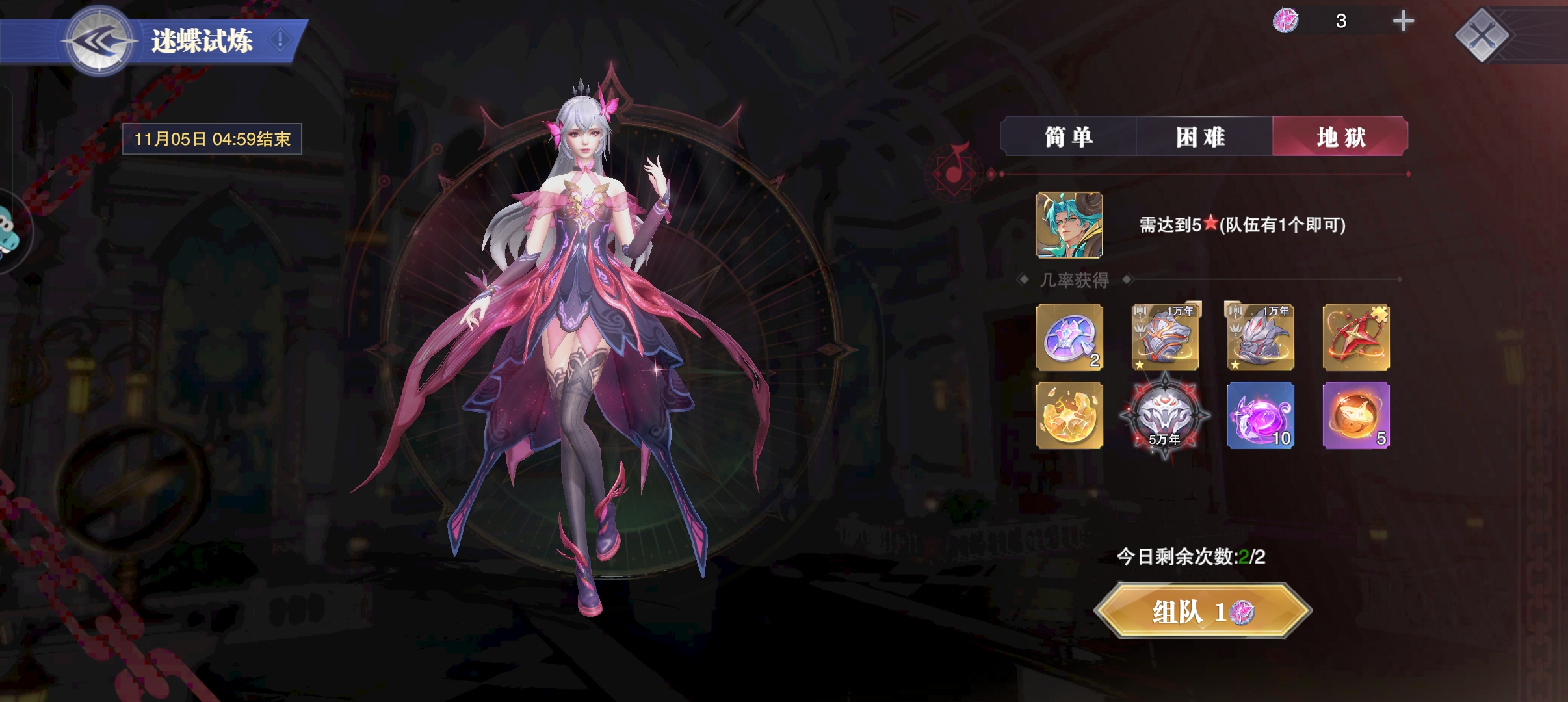 迷蝶试炼是获得我们【迷蝶印记】的主要地方。分为3个难度:【简单】【困难】【地狱】。