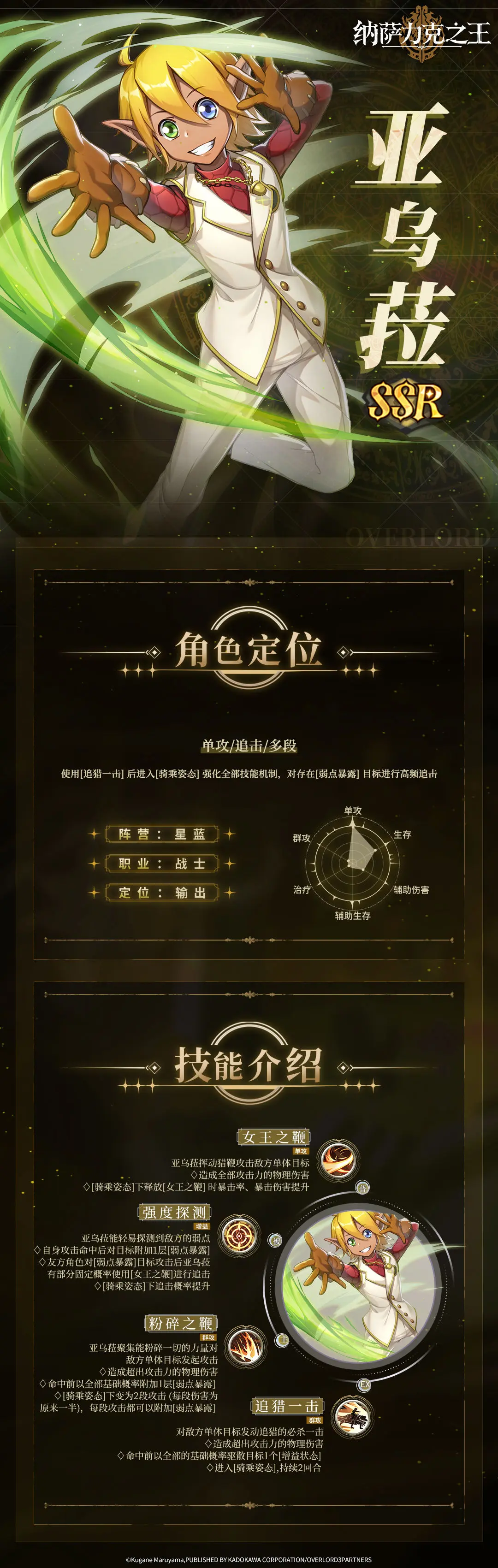 今天给大家介绍的是OVERLORD正版授权手游《纳萨力克之王》将会出现的角色——亚乌菈, 更多角色等待解锁中!大家敬请期待~