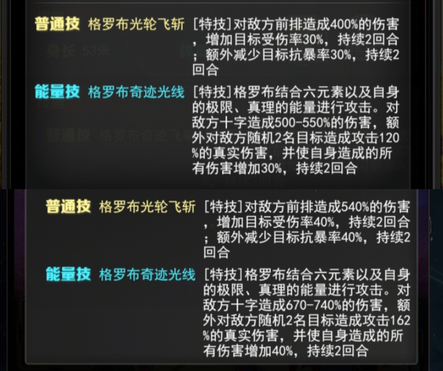 普通技格罗布光轮飞斩[特技]对敌方前排造成400%的伤害