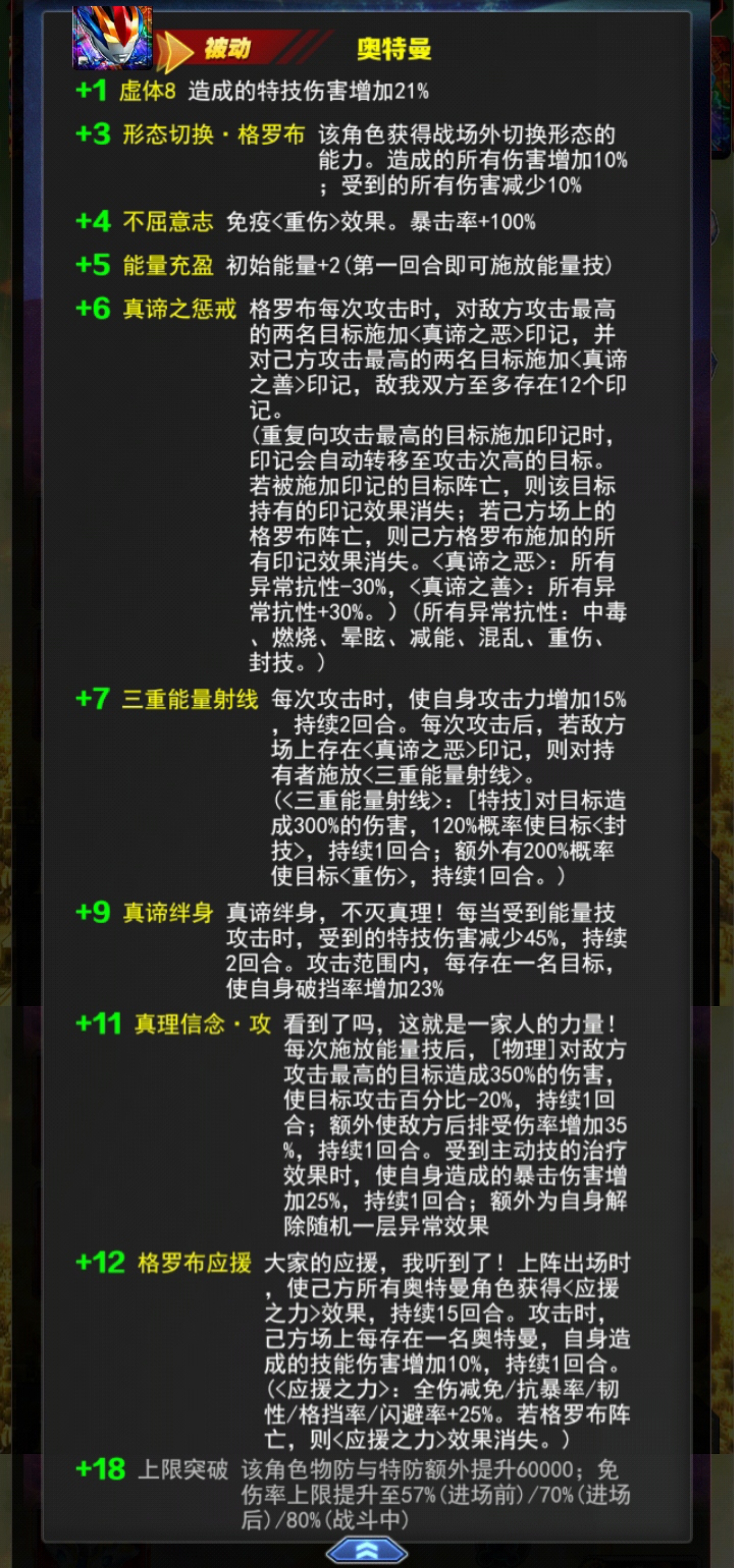 +9 真谛绊身直谛绊身,不灭真理!每当受到能量技攻击时,受到的特技伤害减少45%,持续