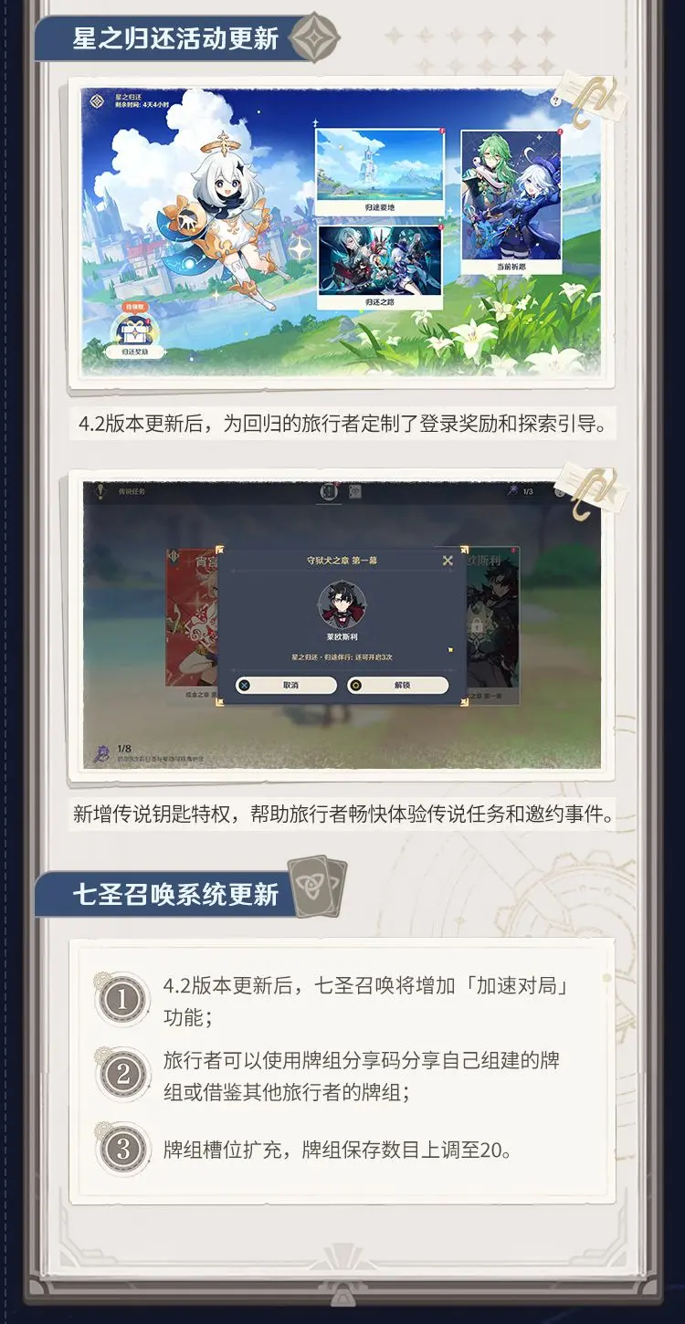 《原神》4.2版本「罪人舞步旋」前瞻特别节目回顾长图原神 - 新闻星发布于 2023-11-03关注 《原神》4.2版本「罪人舞步旋」将于2023年11月8日上线。感谢各位旅行者的支持与陪伴,我们将为大家带来更多4.2版本的最新消息~本次特别节目中的兑换码将于11月4日12:00:00失效,记得尽快兑换哦~