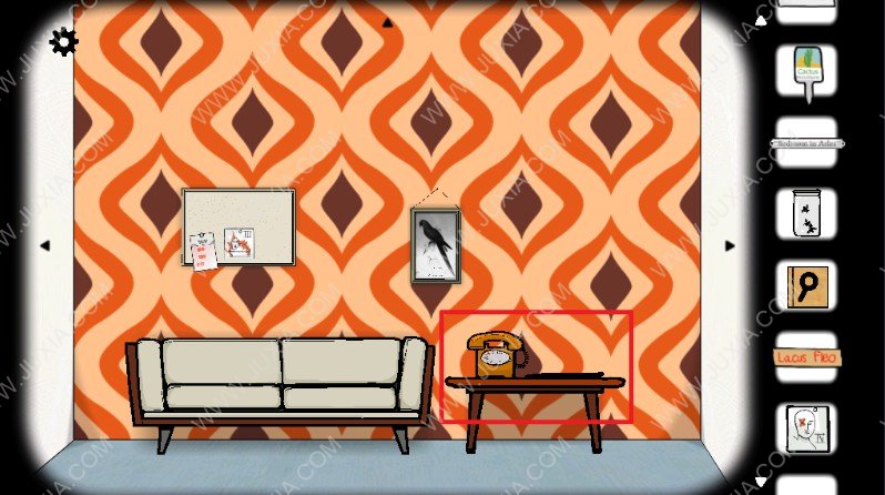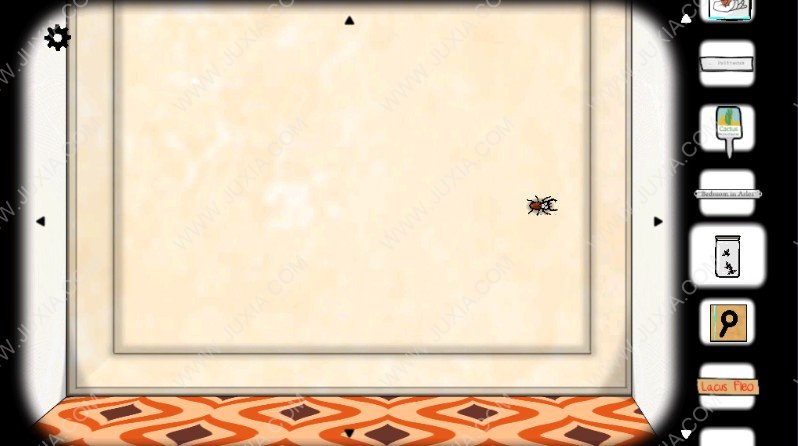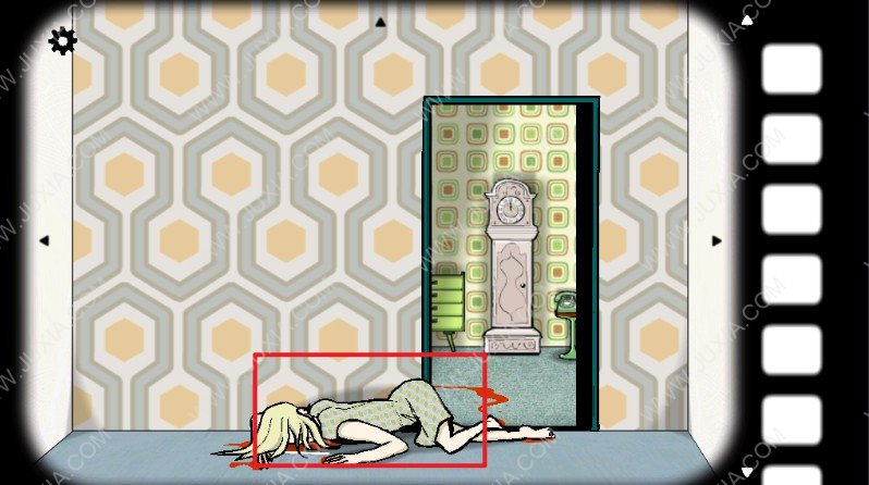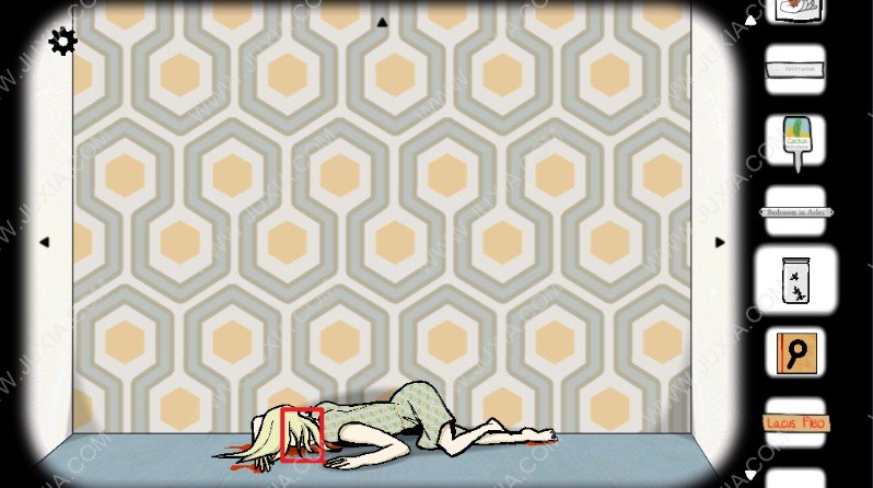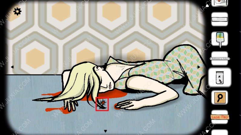 11. 我们来到尸体的房间,首先点击们将门关上,然后点击下图红色框尸体的头发将其拨开,然后点击尸体的嘴巴,我们可以看到一只虫子从尸体的嘴巴里面爬了出来,随后我们点击虫子一只跟着虫子移动场景(先是尸体嘴中出来,走过地板,之后到沙发场景的沙发左边后面,之后到天花板,之后到窗帘窗子场景上面,之后是尸体上面墙上,之后是仙人掌背后,最后爬到写字台后面点击放大写字台)。将虫子赶到有熨斗的场景后,点击。电熨斗抬起来,然后点击虫子让它爬下去然后你懂的,再次抬起来可以得到虫子变成的钥匙。