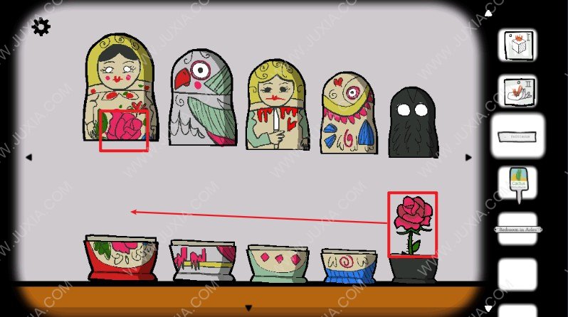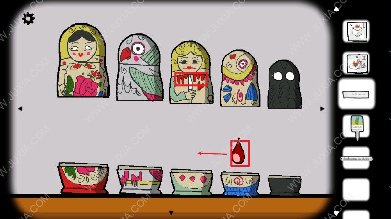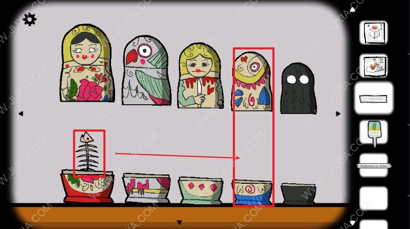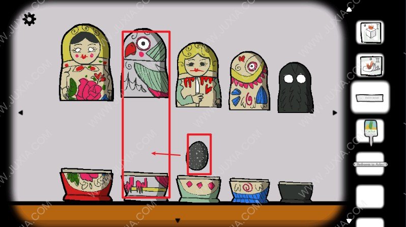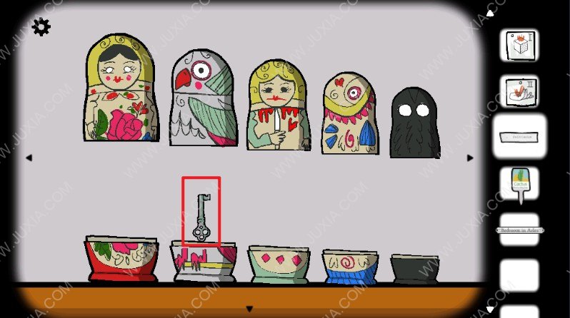 6. 我们将下图红色框位置的俄罗斯套娃打开,将套娃里面的物体按照套娃上面图案将其对应摆放,最终我们点击获得钥匙。