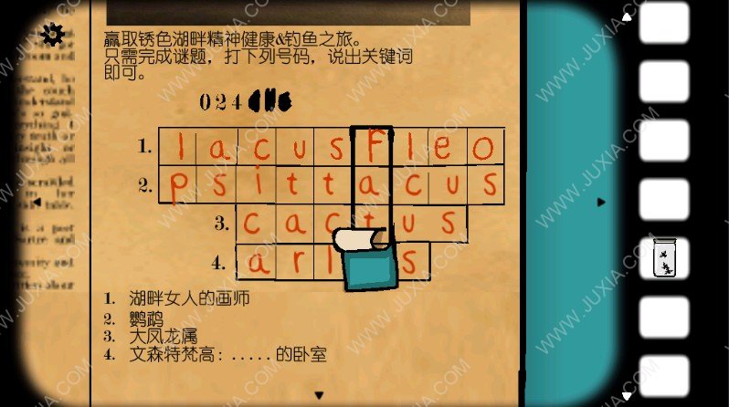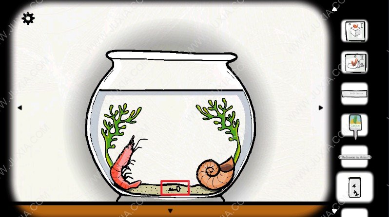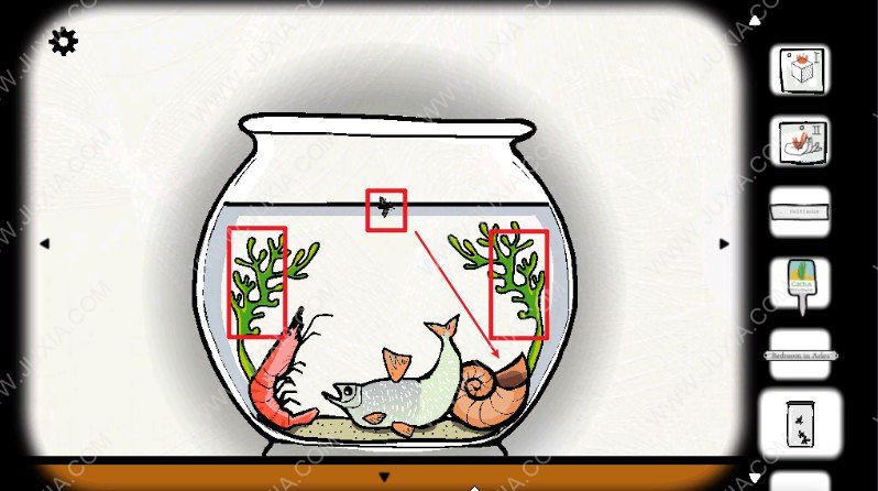 8. 点击下图红色框位置的鱼缸,将苍蝇放入鱼缸我们利用两边的绿色水草让昆虫飘入海螺口,这时会有一根手指将昆虫拉进去,随后将发光的昆虫扔出来,我们控制两边的绿色水草将让昆虫飘入鱼的嘴里,随后鱼会变为一把钥匙,我们点击获得。