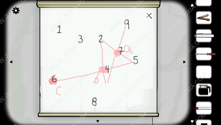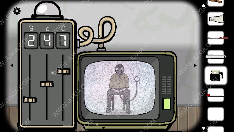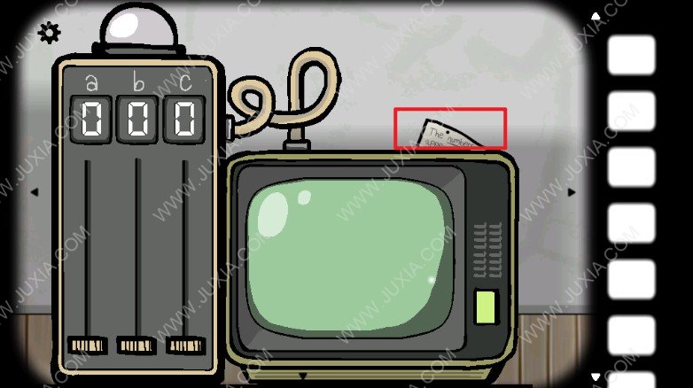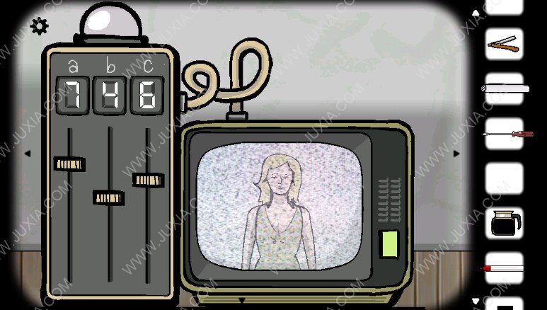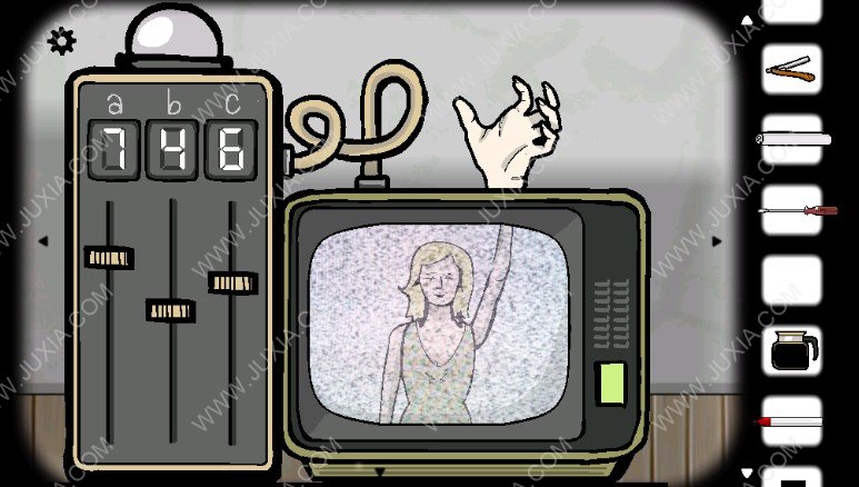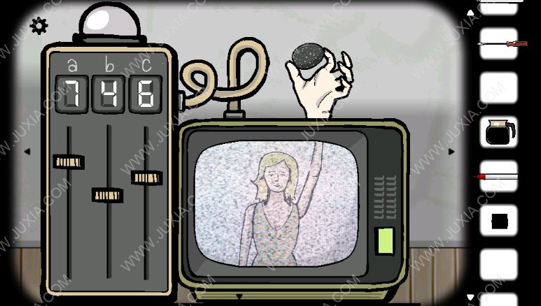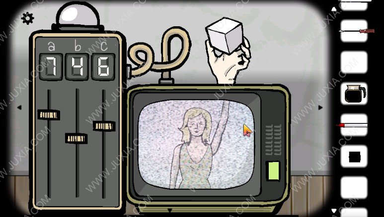 45.这里我们将投影布上面的获得的数字746输入电视机里面,连续点击画面,电视机里面的女人会将手从电视机里面伸出来,我们将获得的黑色蛋放在她的手里,点击画面我们获得白色的方块。