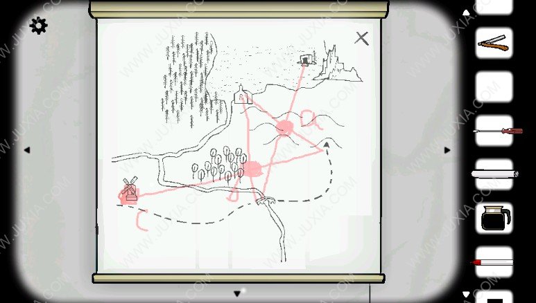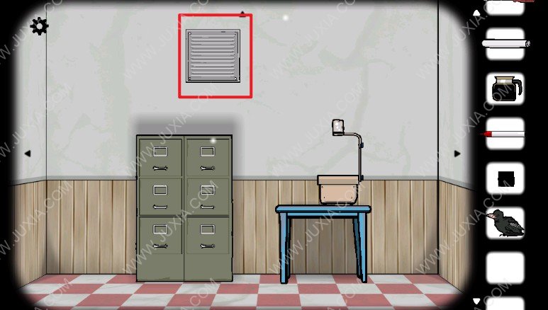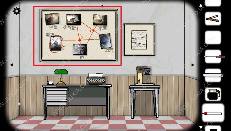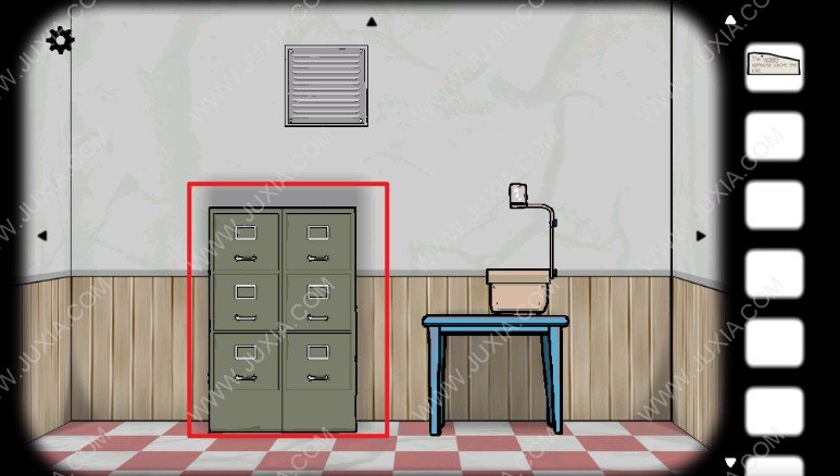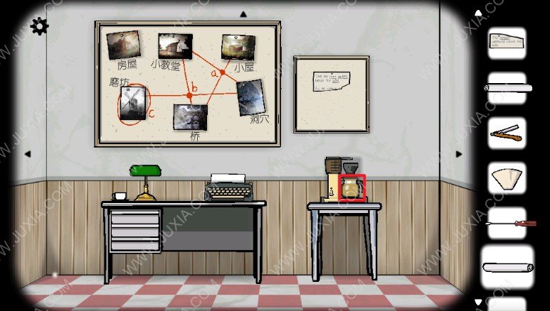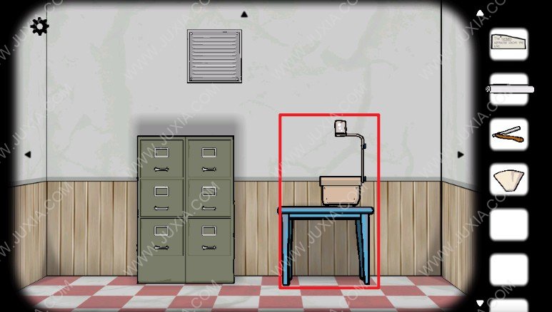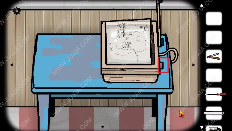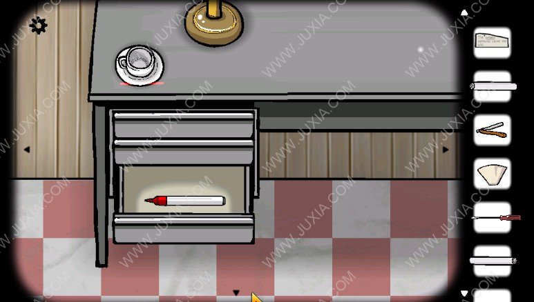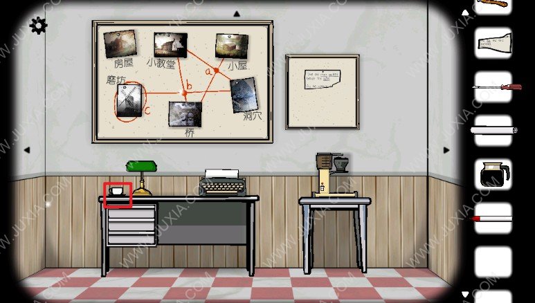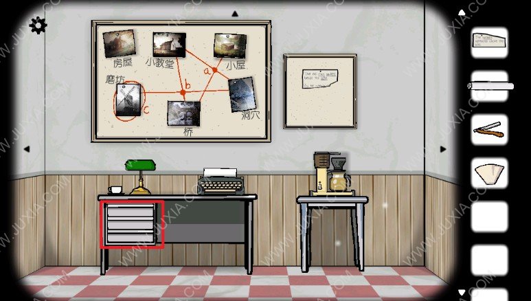 25.随后我们来到下图场景点击红色框位置的柜子,打开抽屉获得地图、剃须刀、咖啡滤纸。
