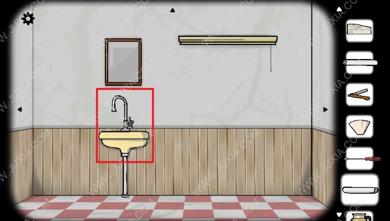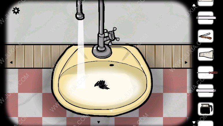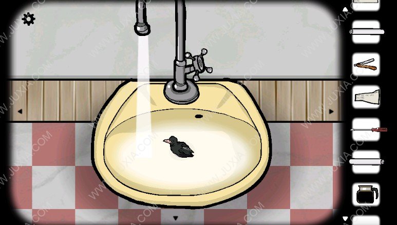 36.我们点击下方的水龙头,可以看到水池里面的胡子,将水打开,我们可以看到胡须成了一团,连续点击之后胡须变为一只小乌鸦,我们点击获得小乌鸦。