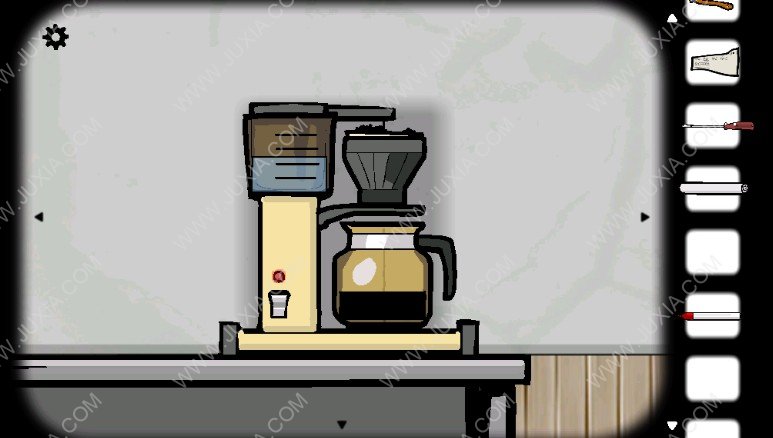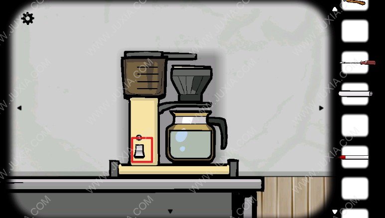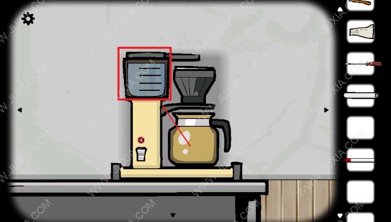 30.我们再来到咖啡机的位置,将咖啡壶里面的水倒入下图红色框,随后将漏斗形的过滤纸放入,再将咖啡放入,将咖啡杯放在下面,打开红色框位置的开关,点击获得装满咖啡的壶。