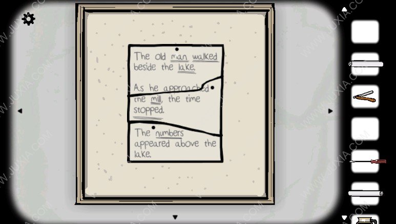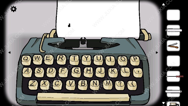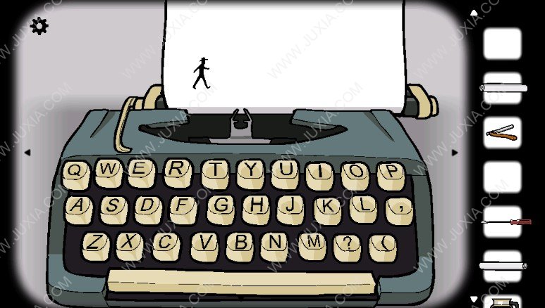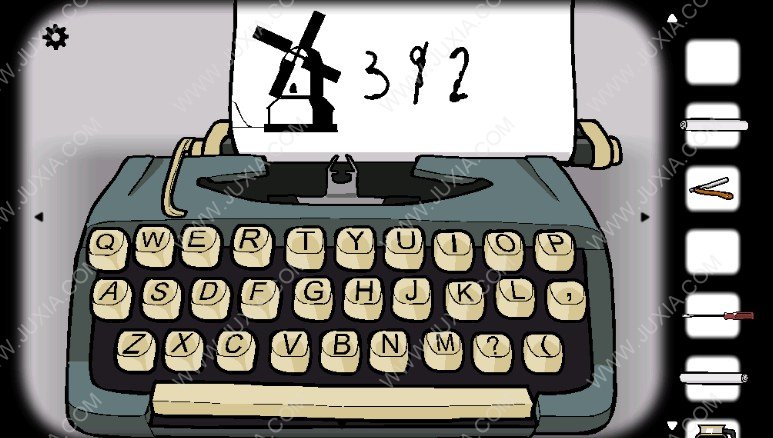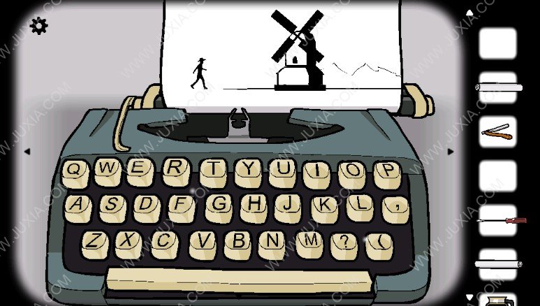 40.将纸张上面划横线的六个单词依次输入在左边的打字机上面,注意这里我们输入第一个英文单词“man”的时候纸张会出现一个小黑点,我们点击黑点使其变成一个小黑人,如下图所示;输入“walked”小黑人便开始走动;“lake”后方会出现背景;输入“mill”会出现一个风车,随后小黑人走进风车内;输入“stopped”画面便会静止;输入“numbers”我们点击画面可以获得一串数字392。
