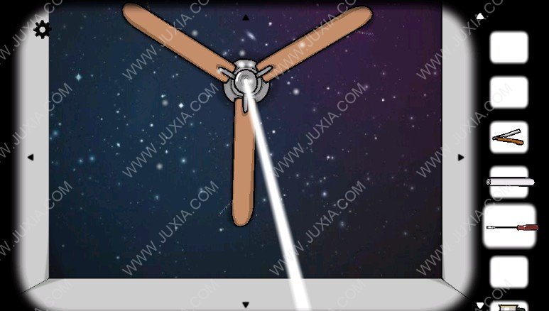 47.最后电视机旁边的仪器会射出一道白色的光打在天花板的风扇上面,我们将场景切换到天花板,点击风扇开始旋转,天花板变为星空顶,第二章结束。
