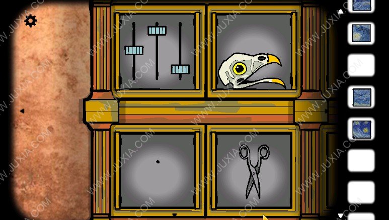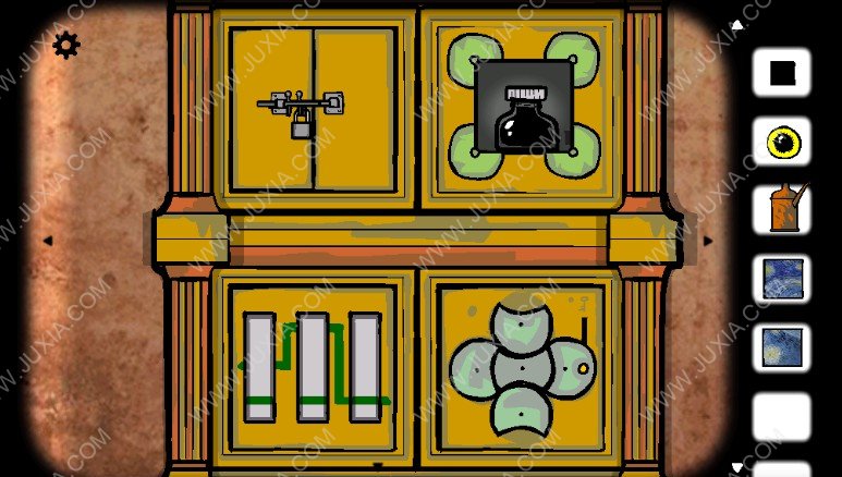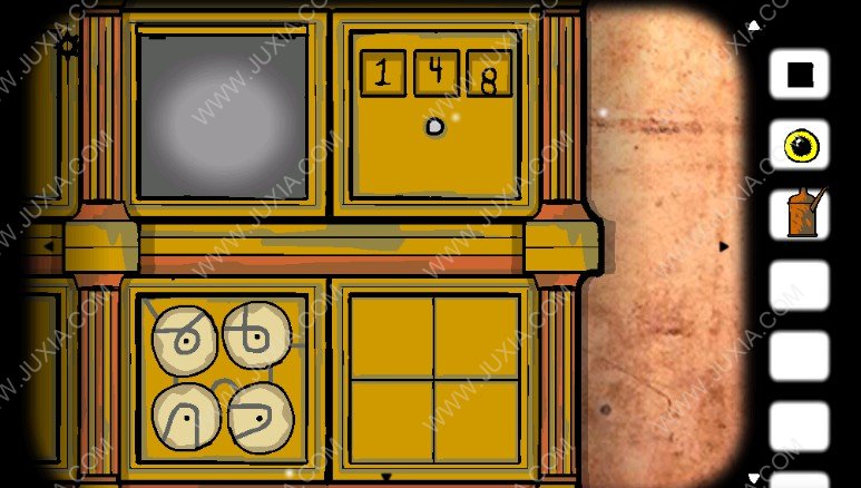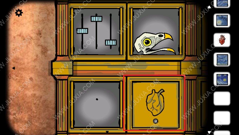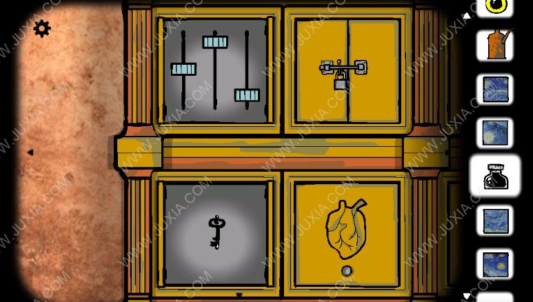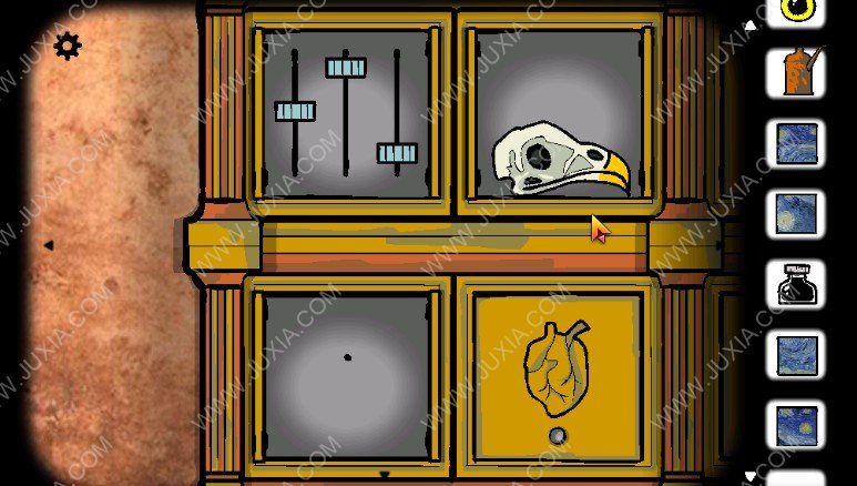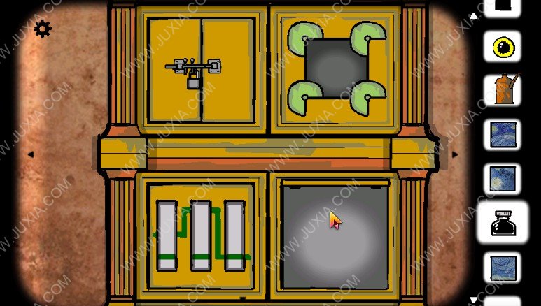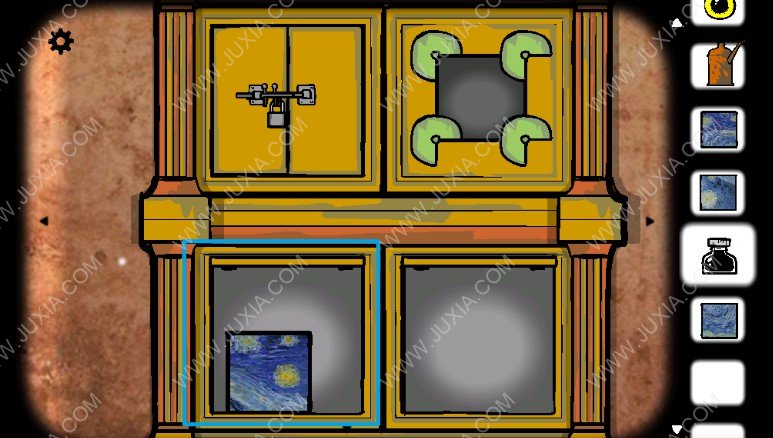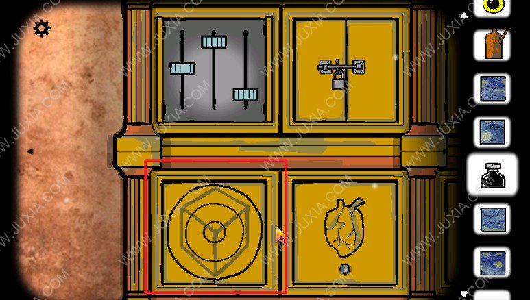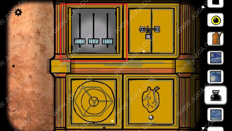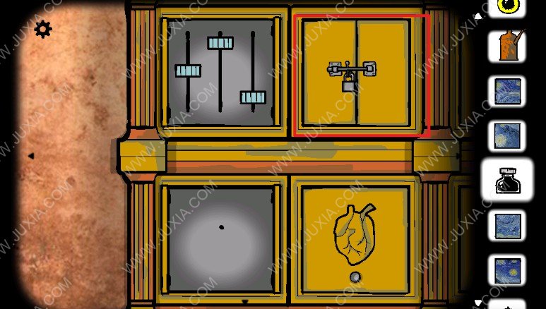 60.将红色框的柜子直接打开,我们按照下图红色框柜子的提示将这里的开关调成如下图所示,然后我们便可以将下图中蓝色框里面的柜子打开了,点击获取其中的图案碎片。