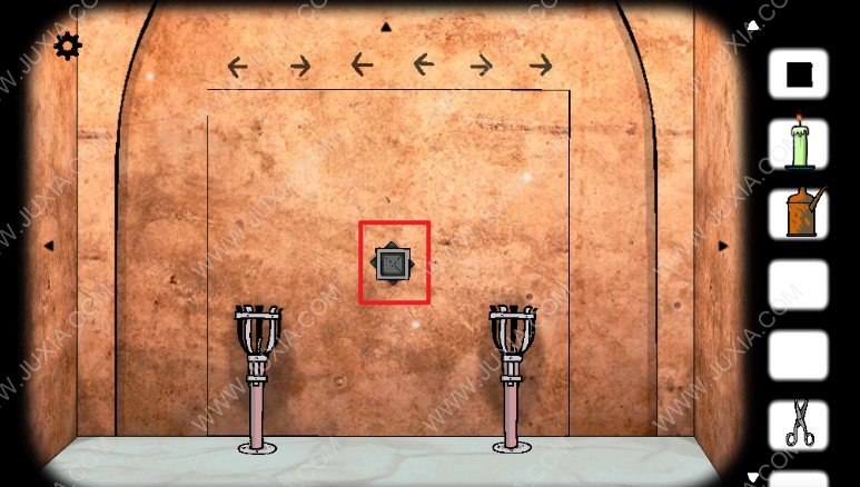 59.这里的机关首先我们将下图两个红色框位置的缺口朝向里面,然后将里面的装置进行转动,然后左右两边的装置旋钮便可以转动,我们转动右边的旋钮机关便可以打开,点击获得里面的图案碎片。
