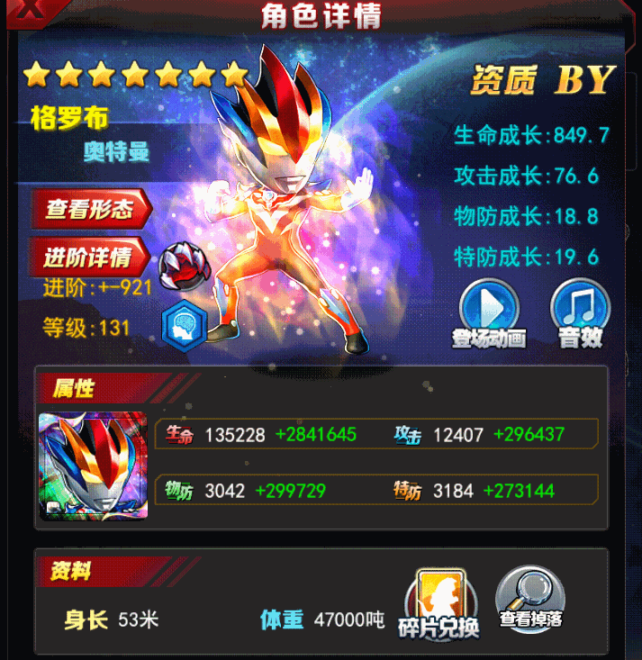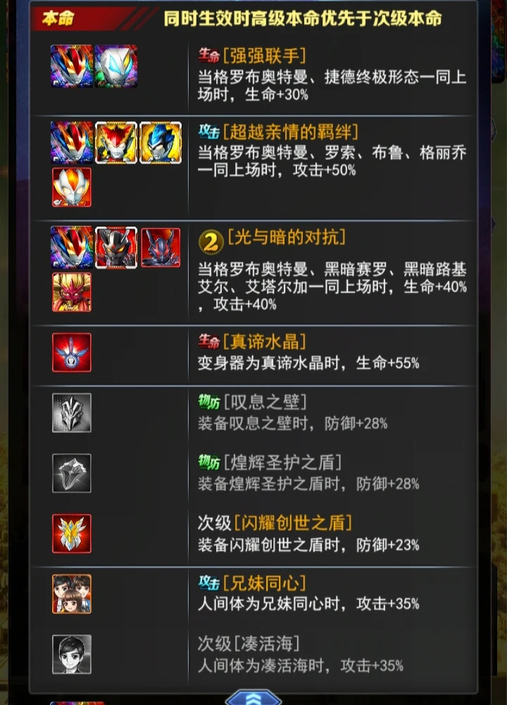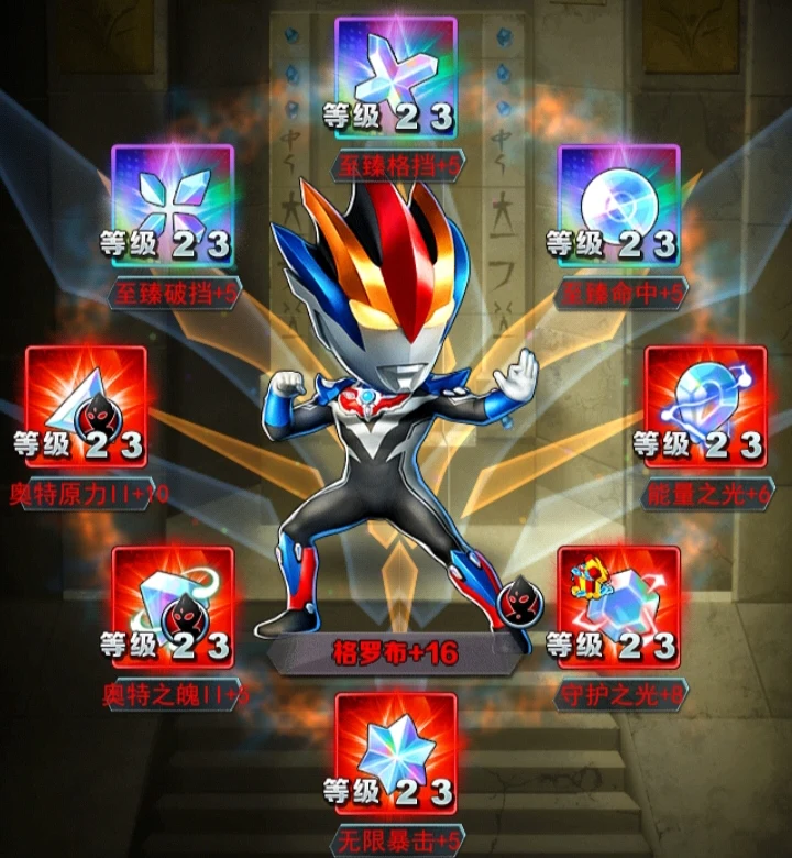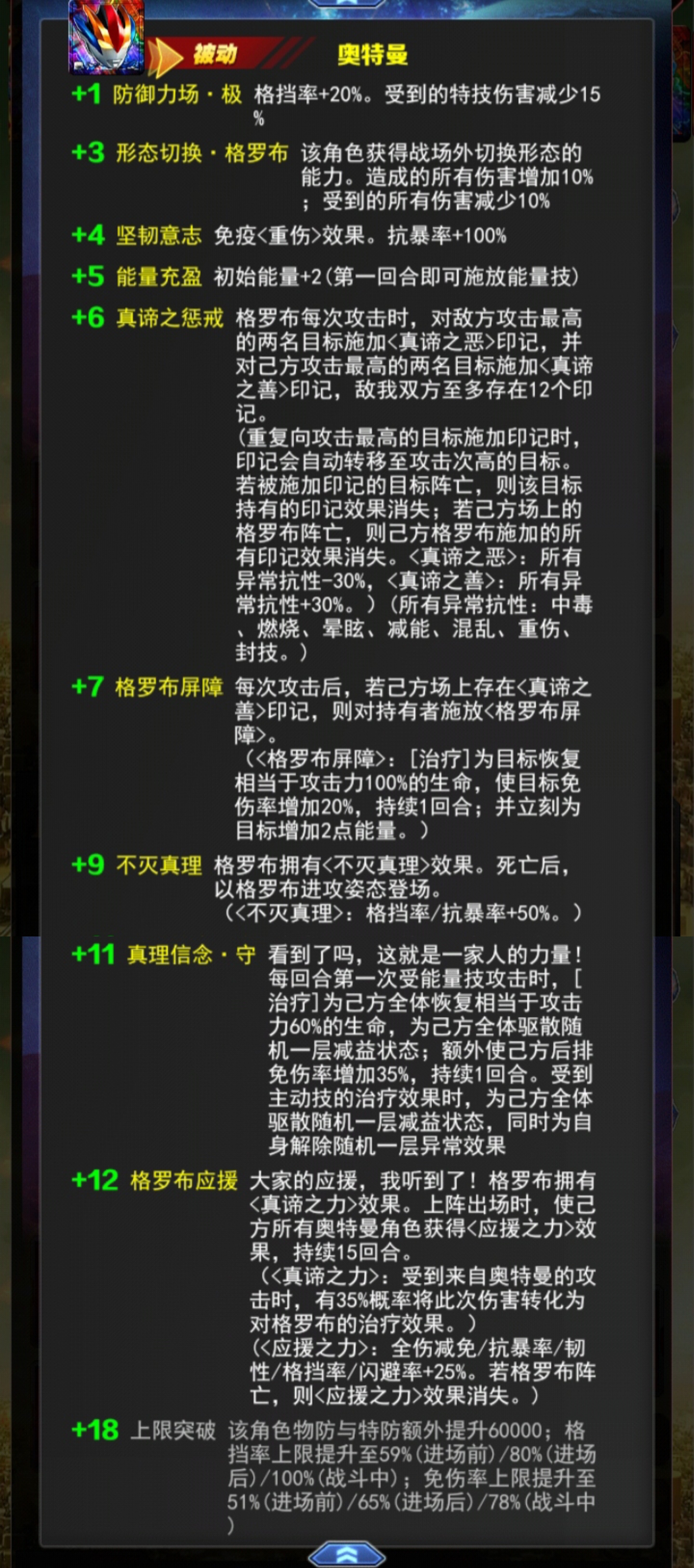 解析:格罗布上场时,使乙方所有奥特曼角色获得一个buff,格罗布的这个buff就是受到来自奥特曼的攻击时有35%的概率是借此攻击转化为格罗布的治疗效果,也就是转化为增加治疗的比例,这个概率不是很高,但也是有几率出发的,后半段就是全体可以获得一个免伤,抗暴韧性格挡闪避,这个形态就属于一个辅助形态