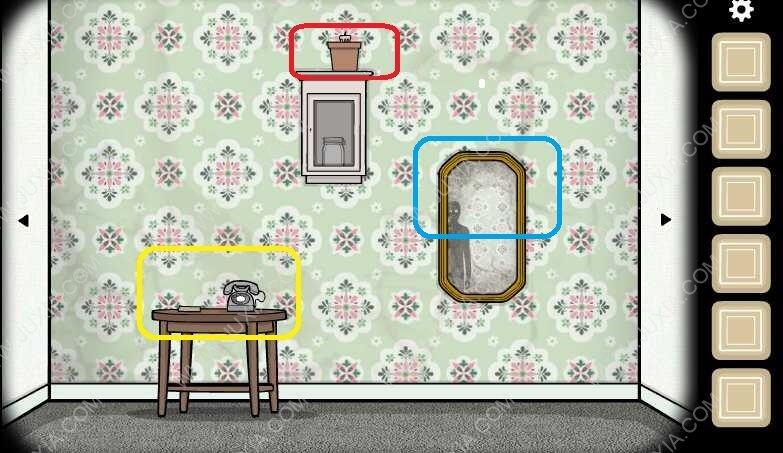 2、下图黄框处点击放大后,信封是无法互动的,拿起电话,仔细听可以听到“enlighten me”的声音,将左边杂乱的字母点击排列正确即可得到一盒火柴。红框处的花盆里可以得到一支蜡烛。蓝框镜子里有提示,在很后面会用到,先记得看。2、1、2