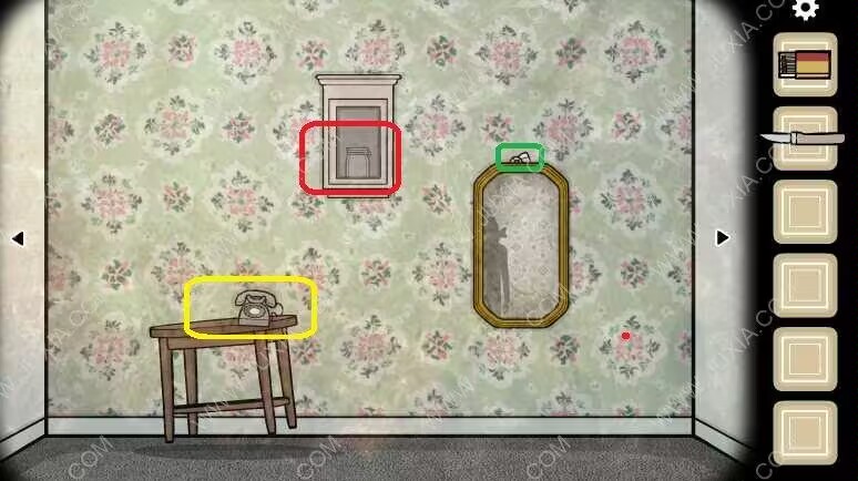 5、下图黄框处点击后使用电话,依照从左到右的顺序点击泡泡,会出现折纸,多次点击到最后可以看到钥匙,钥匙直接对红框处使用就能得到罐子。镜子记得放大看提示,同时可以在绿框处得到一个海螺。5、1