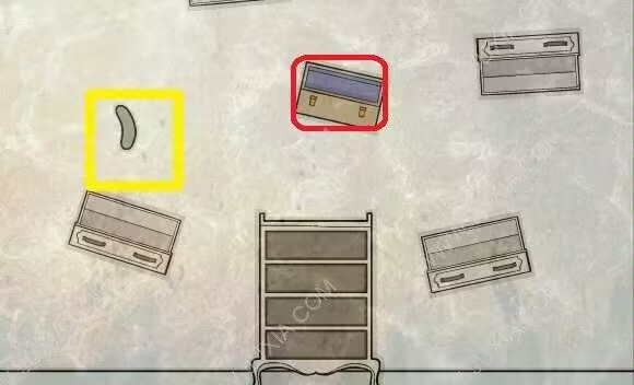 7、抽屉柜的场景,黄框处放大后点击所有的没有阴影的突起物,可以得到一个贝壳。红框水池里也有一个贝壳。7