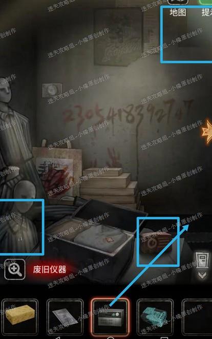 8、向右走点击地上倒下的人偶,点开他之后就可以阅读日记了,根据日记的提示,再根据柜子左上的纸条得到密码913707,打开柜子点击中间的纸团,将蓝色仪器放上去就会砸破手表壳,我们就可以得到分针了,在手表旁边见到绝缘胶布。