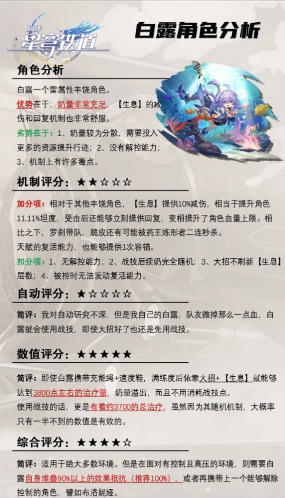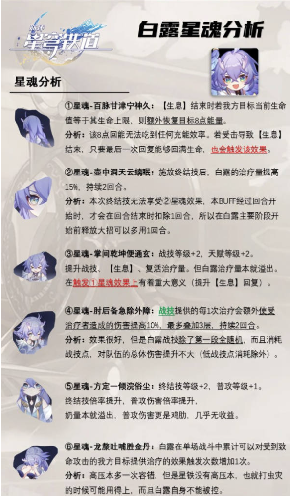 白露的缺点:1、没有解控能力;2、许多机制上的缺点;3、奶量分散在天赋、大招、战技,需要投入更多的资源;4、所有星魂提升都较小(①星魂需要练度、④星魂需要输出位不怎么消耗战技点)
