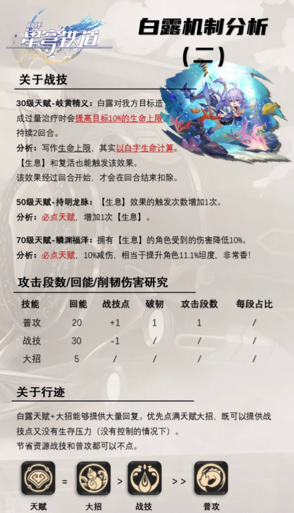 白露的优点:1、数值够高;2、【生息】提供减伤和治疗,变相提升坦度和生命上限;3、1次复活容错