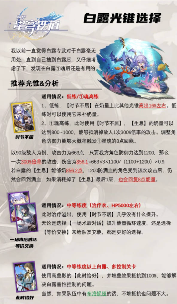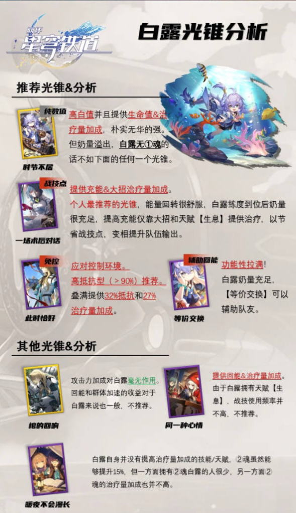 【等价交换】、【一场术后对话】是我最推荐的两个光锥,因为白露练度达标后奶量溢出,所以这两个能够提供功能性的光锥特别好用。