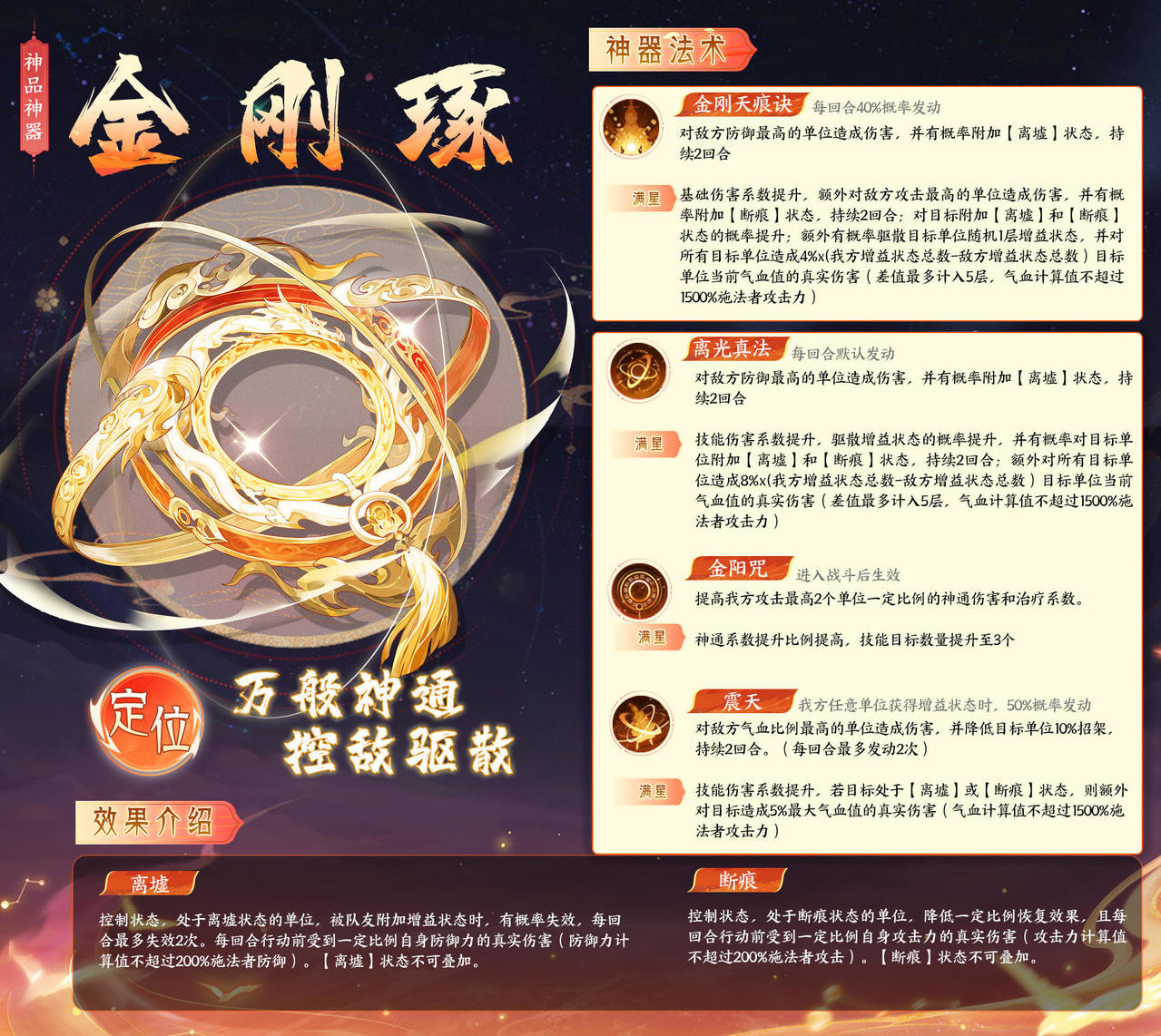 ●神通·金刚天痕诀:对敌方全体造成360%伤害,并有50%概率驱散目标单位随机1层增益状态。