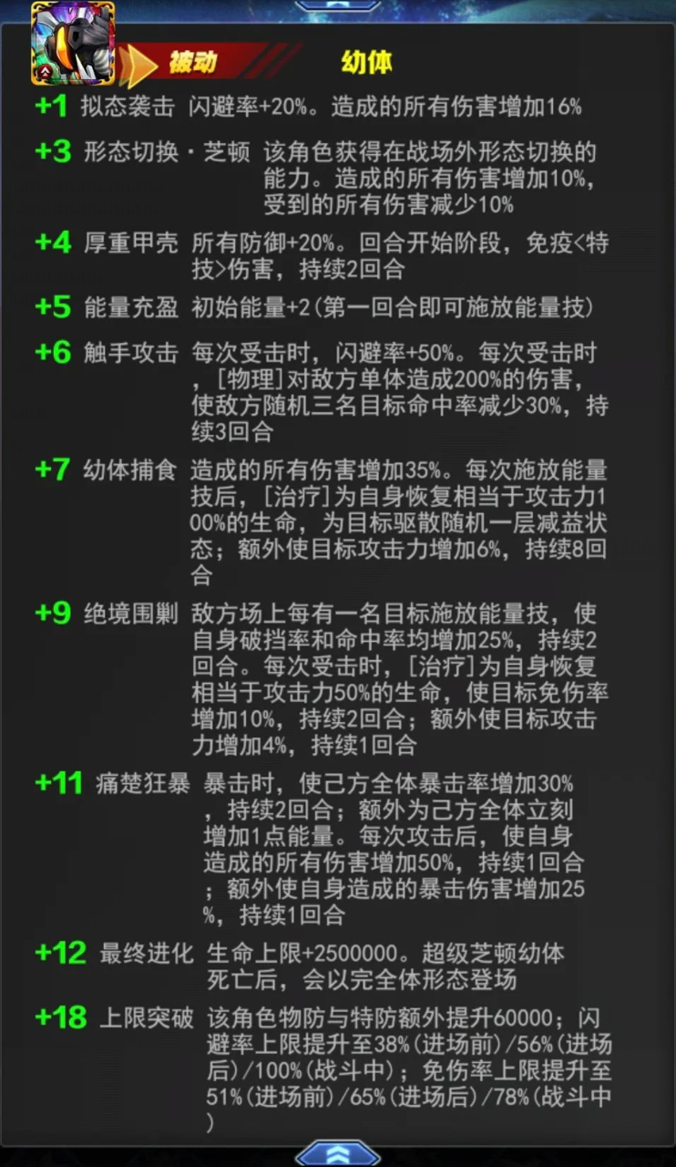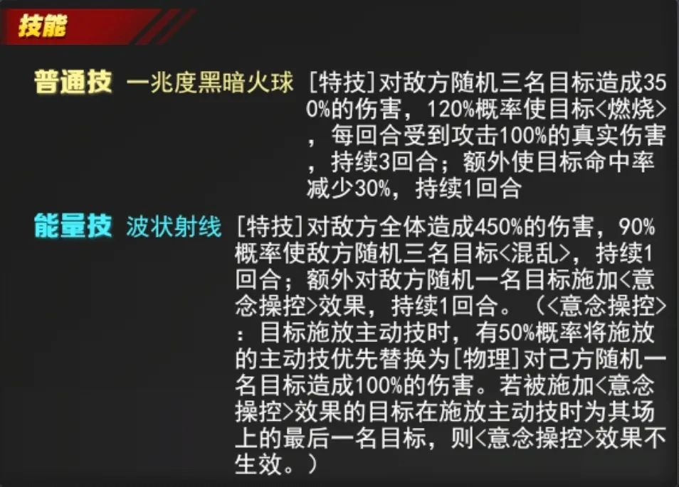 能量技:波状射线 [特技]对敌方全体造成450%的伤害,90%概率使敌方随机三名目标<混乱>,持续1回合;额外对敌方随机一名目标施加<意念操控>效果,持续1回合。(<意念操控>):目标施放主动技时,有50%概率将施放的主动技优先替换为[物理]对己方随机一名目标造成100%的伤害。若被施加<意念操控>效果的目标在施放主动技时为其场上的最后一名目标,则<意念操控>效果不生效。)超越技: