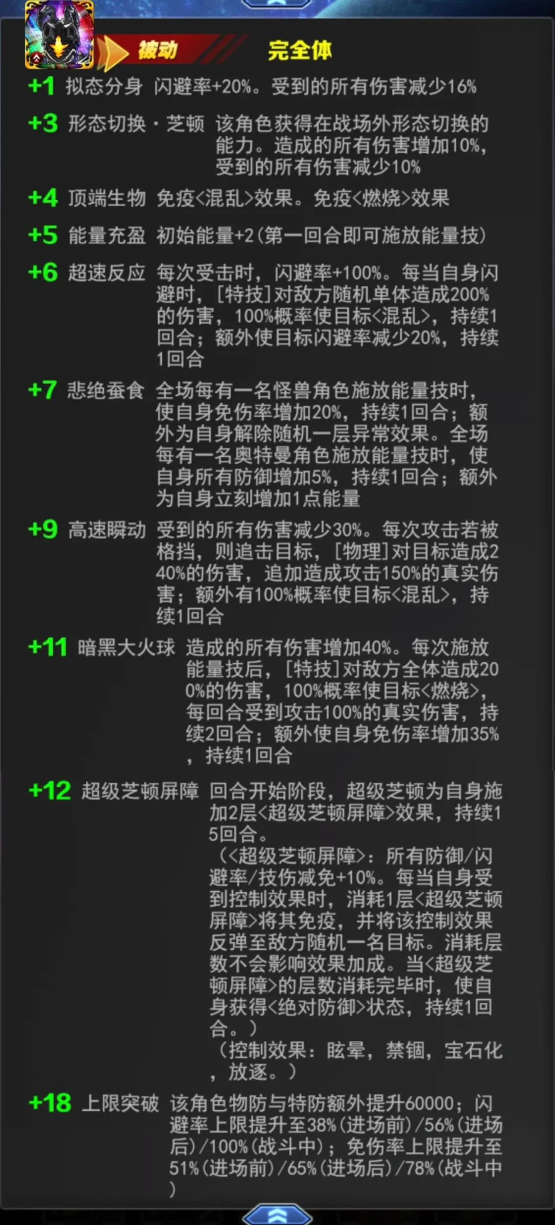 能量技:黑暗火球 [特技]对敌方全体造成450%的伤害,100%概率使目标<燃烧>,每回合受到75%的真实伤害,持续3回合;额外使目标受伤率增加30%,持续2回合超越技: