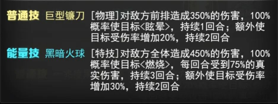 普通技:巨型镰刀 [物理]对敌方前排造成350%的伤害,100%概率使目标<眩晕>,持续1回合;额外使目标受伤率增加20%,持续2回合