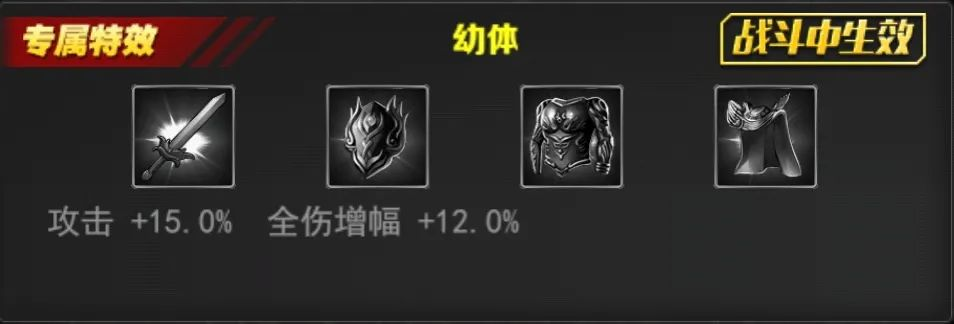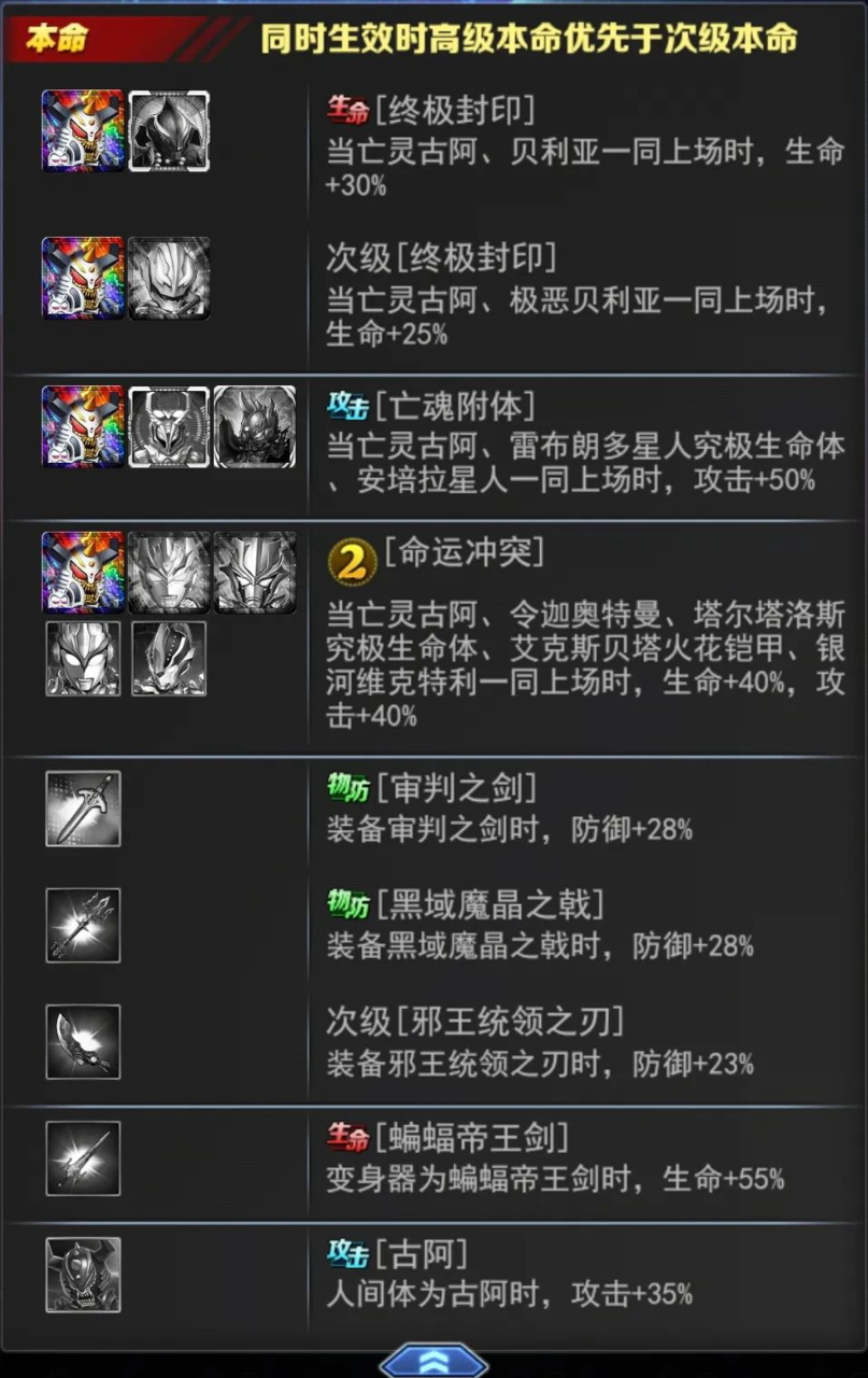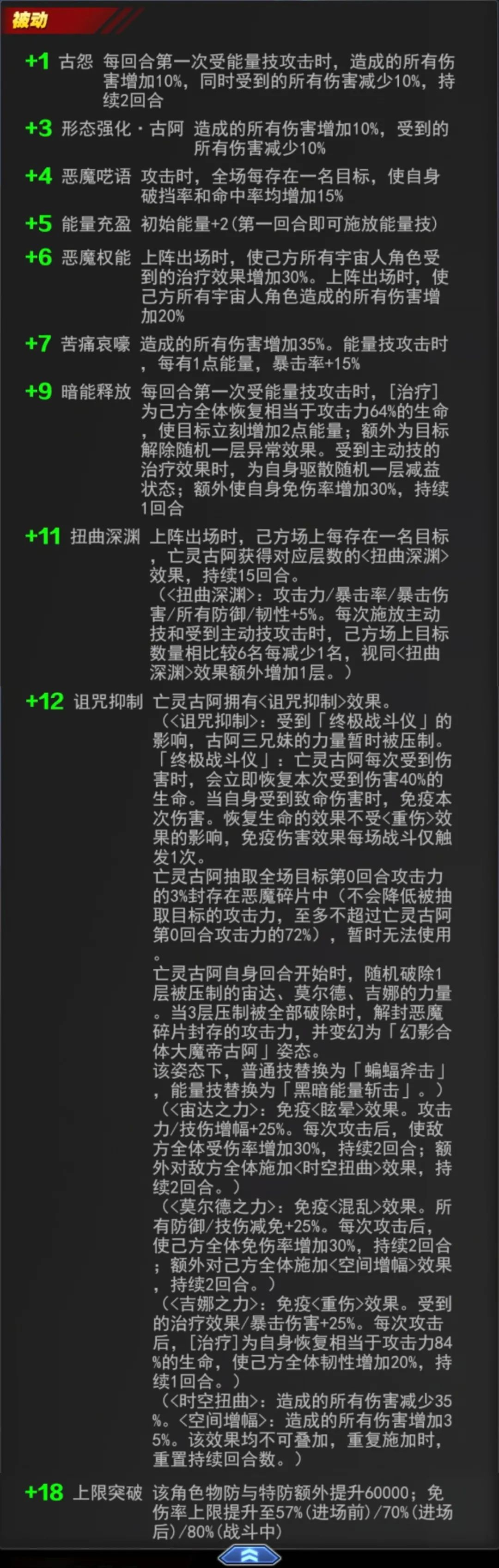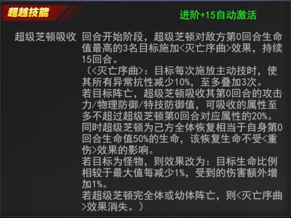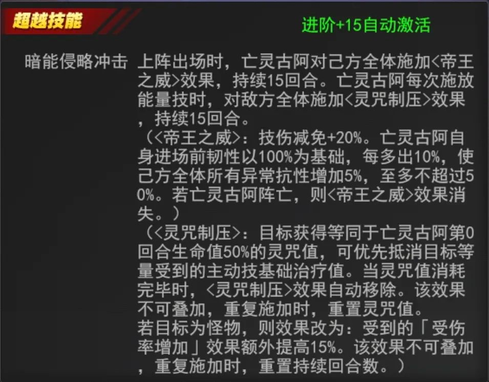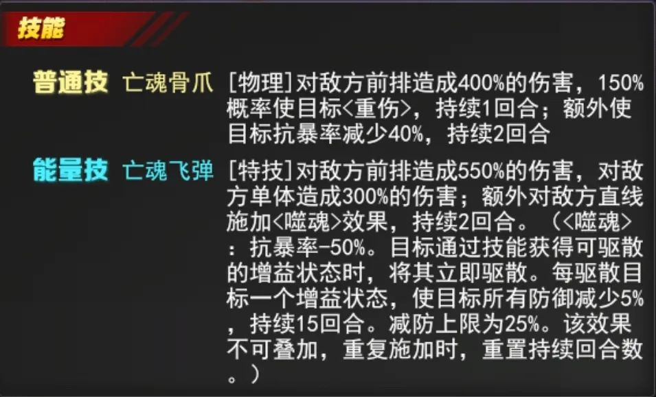 普通技:亡魂骨爪 [物理]对敌方前排造成400%的伤害,150%概率使目标<重伤>,持续1回合;额外使目标抗暴率减少40%,持续2回合能量技:亡魂飞弹 [特技]对敌方前排造成550%的伤害,对敌方单体造成300%的伤害;额外对敌方直线施加<噬魂>效果,持续2回合。(<噬魂>:抗暴率-50%。目标通过技能获得可驱散的增益状态时,将其立即驱散。每驱散目标一个增益状态,使目标所有防御减少5%,持续15回合。减防上限为25%。该效果不可叠加,重复施加时,重置持续回合数。)超越技: