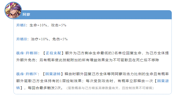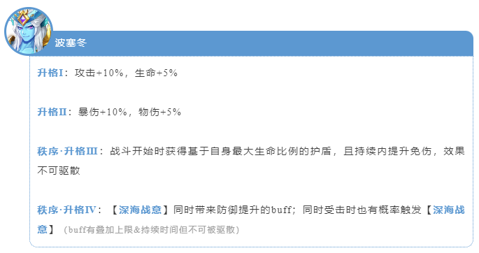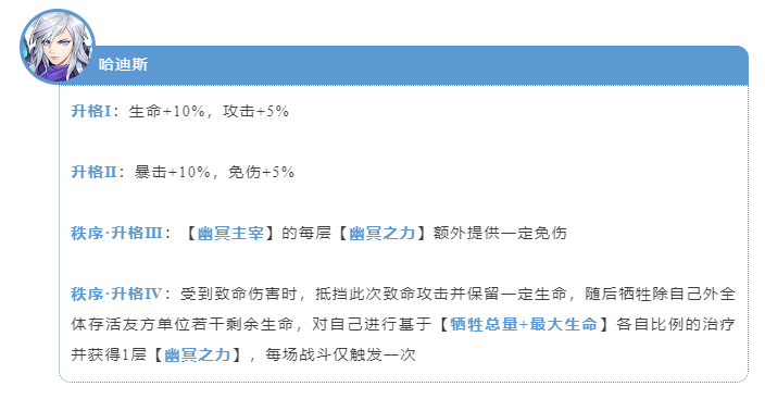 全新技能:战斗开始时,提升持续4回合的攻击力(与常规buff不叠加,效果不可驱散);回合结束时,若哈迪斯持有【幽冥之力】,则有一定概率立即发动一次较弱的【灵魂挽歌】,技能释放后有概率消耗1层【幽冥之力】,触发后技能进入冷却时间。