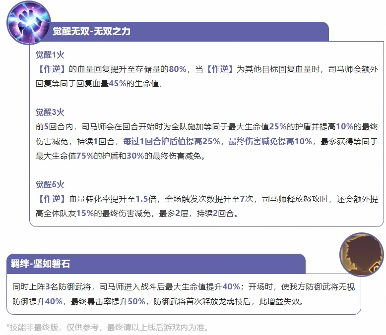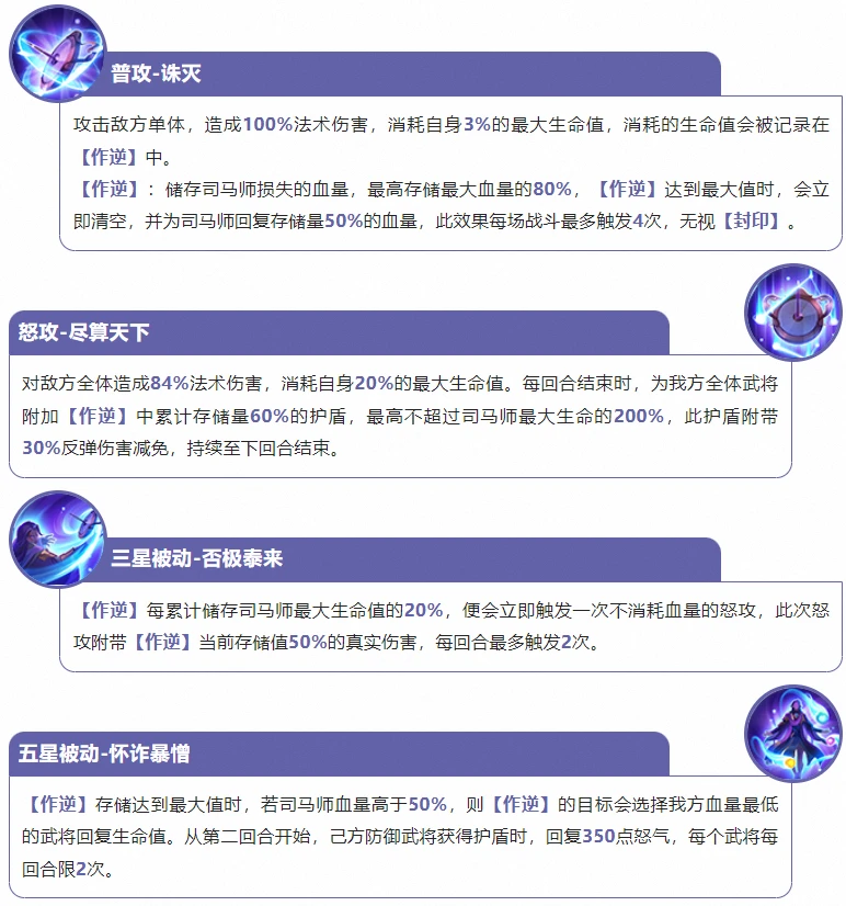 司马师的动作围绕他的冷酷无情和斯文有礼这两点来处理,在平常动作或个性中他的动作幅度都不大,只有在怒攻或胜利中会展示出一丝“曹魏权臣”的狠辣与野心:怒攻中用自己手中的日晷召唤出行星法阵,连续的打击之后接上整个法阵的爆炸给予敌方最大程度的打击。同时怒攻中的人物动作也是相对幅度最大的,是对他人物性格的一种挖掘。
