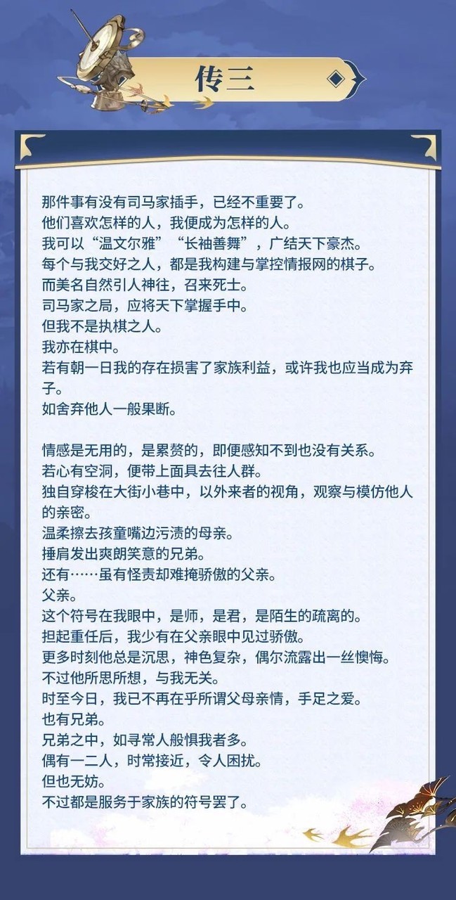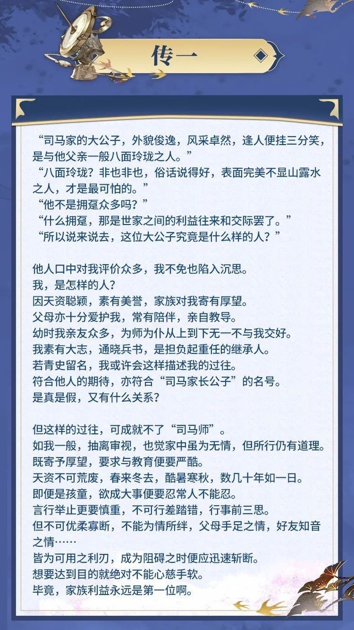 他面对任何事都沉着冷静,一手建立了司马家的情报网,将一部分人培养成了自己的死士,这些死士在后续的事件中发挥了关键作用。