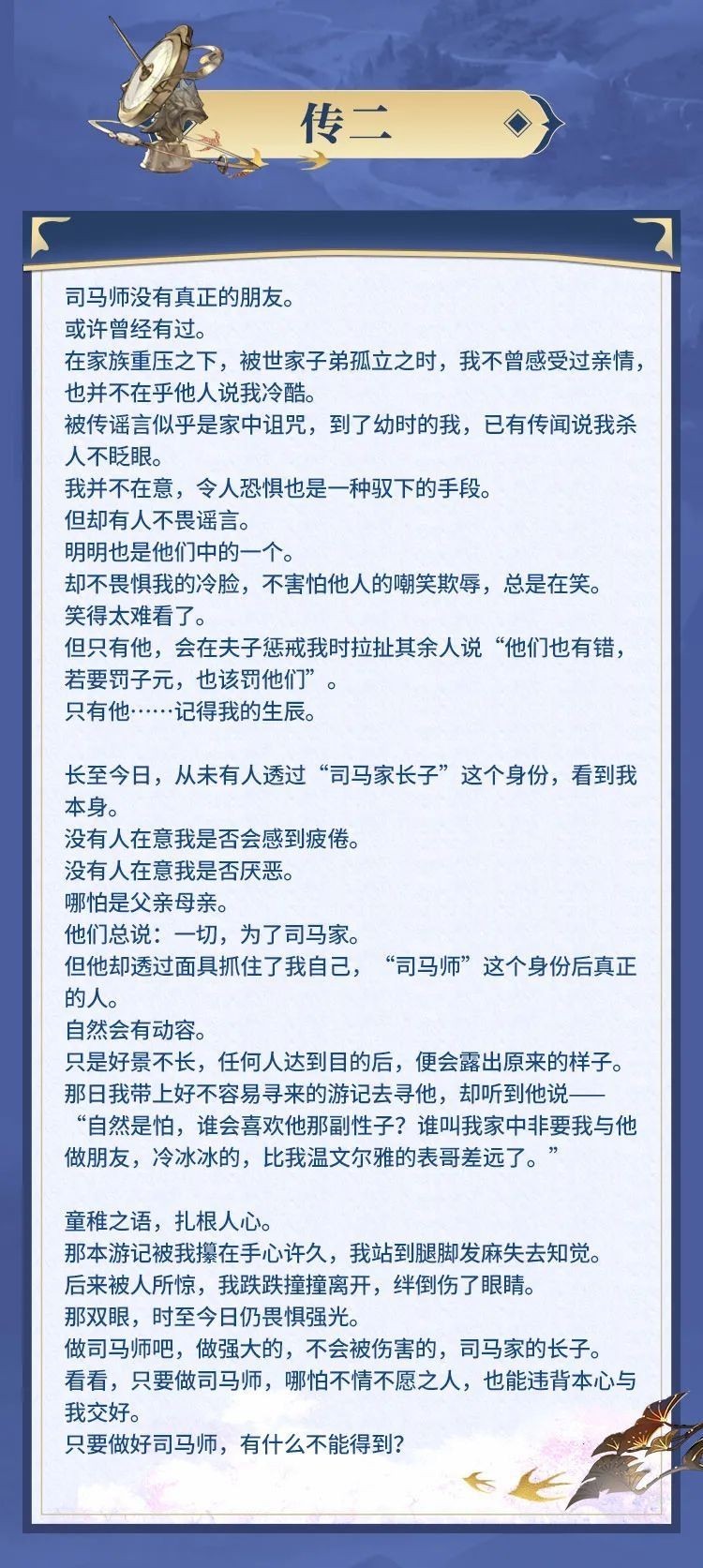 一件年少往事曾让他不慎跌倒伤了眼睛,因此开始畏惧强光,浑浑噩噩许久后,再度出现的司马师戴上了温文尔雅的面具,风采卓然又擅长交际的他很快拥有了许多朋友,但只有他自己知道,这些朋友不过是手中的工具而已。