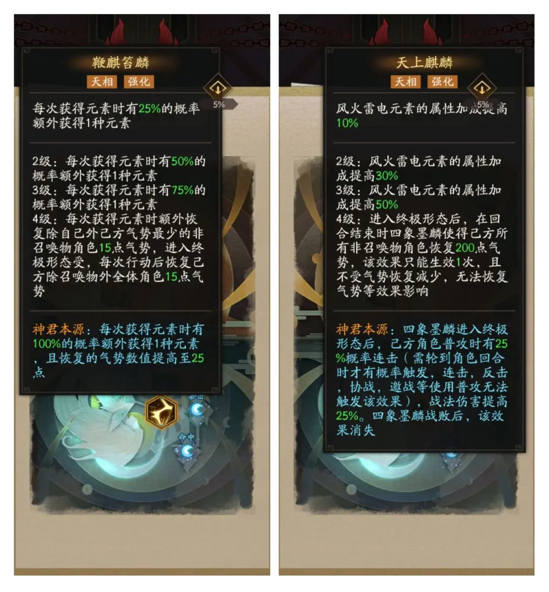 【天上麒麟】使得元素切换带来的属性加成大大提升,还能为我方一次性提供大量气势,变身后更可令己方角色战法伤害提高且普攻有概率连击。【鞭麒笞麟】则能加快四象墨麟元素切换的效率,还能持续为队友恢复气势。