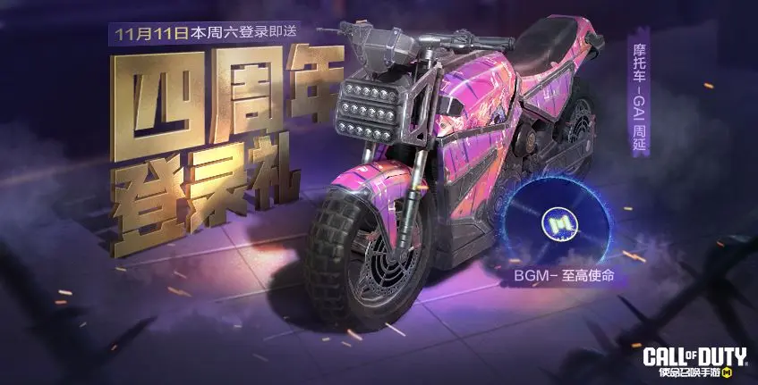 11月8日,四周年登录礼上线,战士们前往游戏预约,并于11月11日登录游戏,就能获得摩托车-GAI 周延和BGM-至高使命、BGM-In the Zone。