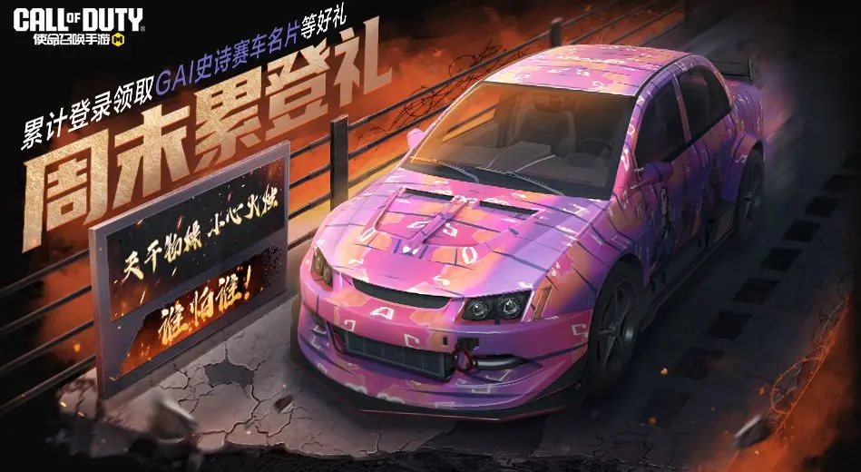 11月11日,周末累登礼如期而至,战士们参与活动,累计登录即可获得GAI哥联名史诗级道具:贴纸-我命硬,学不来弯腰、名片-天干物燥,小心火烛、喷漆-谁怕谁!、赛车-GAI 周延。
