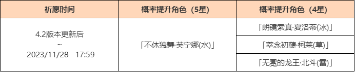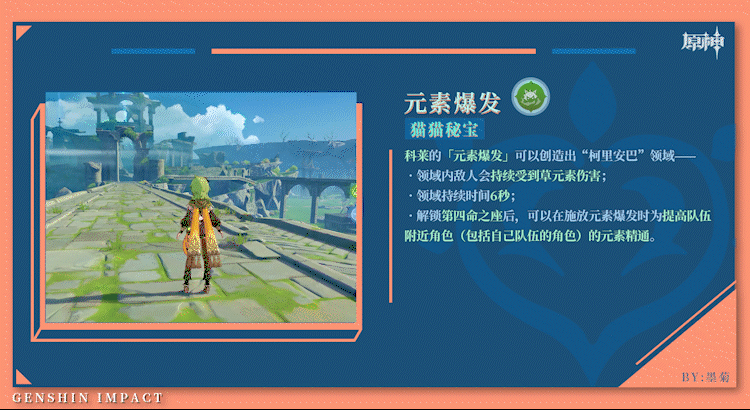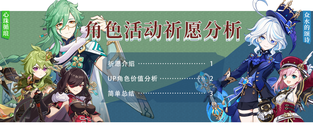草元素生存辅助向法器角色。距离上一次up,其装备搭配上没有更新,可以直接参考上次up时的描述。不过在配队上,由于其元素战技有较高的全队治疗量,在芙宁娜的一些队伍中可以作为治疗角色进入。