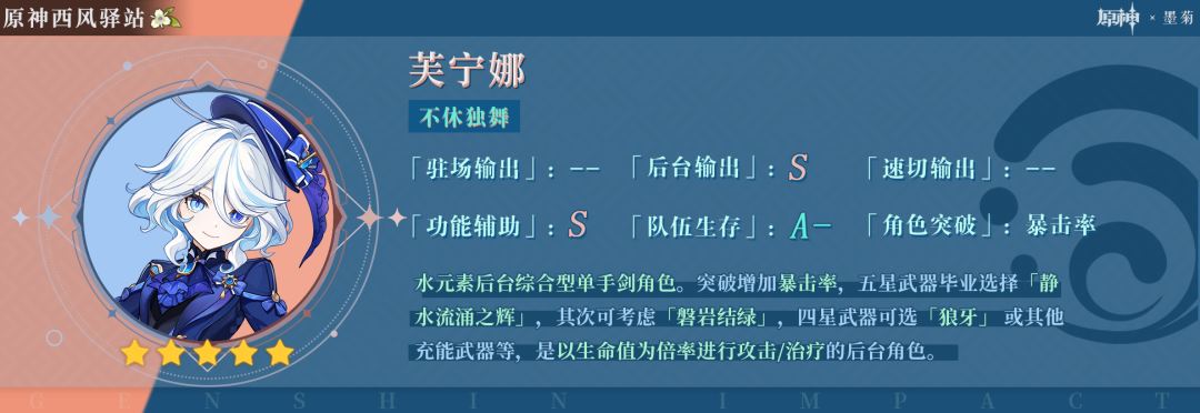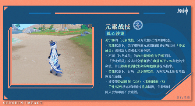 水元素前台输出型角色。具备“芒性”与“荒性”两种状态,不同状态下「元素战技」效果不同,芒性状态下,元素战技能够召唤恢复场上角色生命值的「众水的歌者」,而荒性状态下,元素战技能够召唤自动攻击敌人的三名「沙龙成员」,战技是芙宁娜最核心的输出/治疗手段,伤害/治疗的数值基础均为“生命值”。
