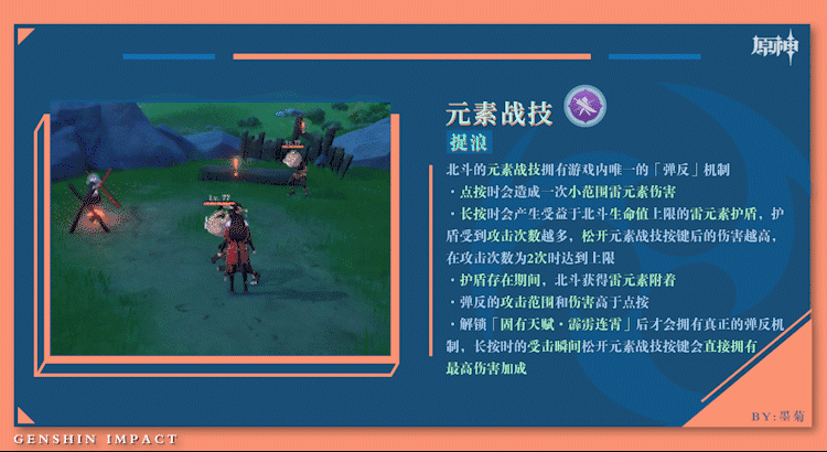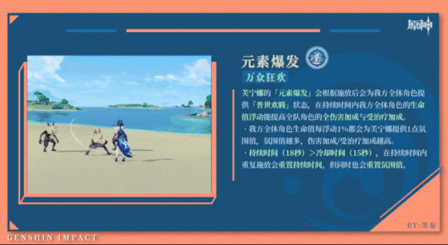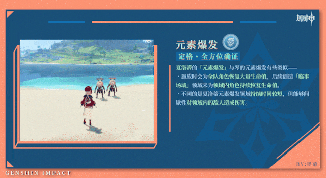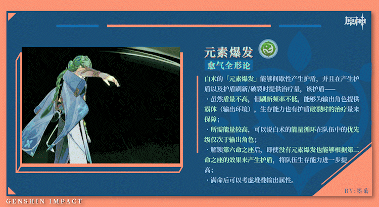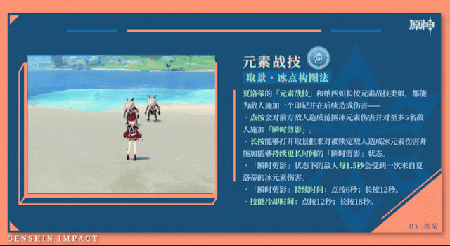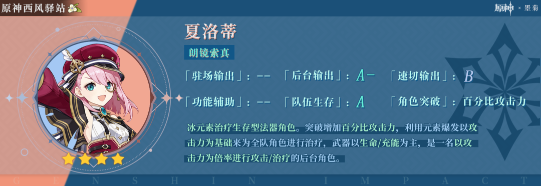 冰元素治疗生存向法器角色。其「元素战技」与纳西妲元素战技类似,能够通过点/长按为敌人施加标记,并间歇性对被标记敌人造成伤害,而「元素爆发」与琴元素爆发类似,能够瞬间抬高全队角色的生命值,并创造一个持续治疗领域,且她们的治疗值均基于“攻击力”提供。