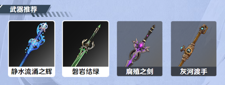 「静水流涌之辉」:低白值高暴伤副词缀的武器,提供的战技加成与生命值提升都与芙宁娜十分契合;