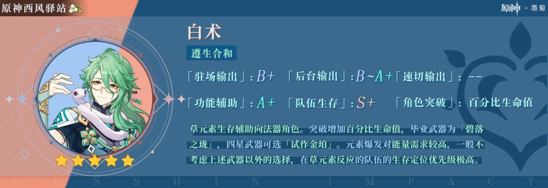 关于抽取的建议:白术在草元素反应的队伍中还是有极高的适用性,虽然不是很多队伍的上限选择,但一定是比较舒适的选择,草元素配队较多的旅行者建议抽取0命。
