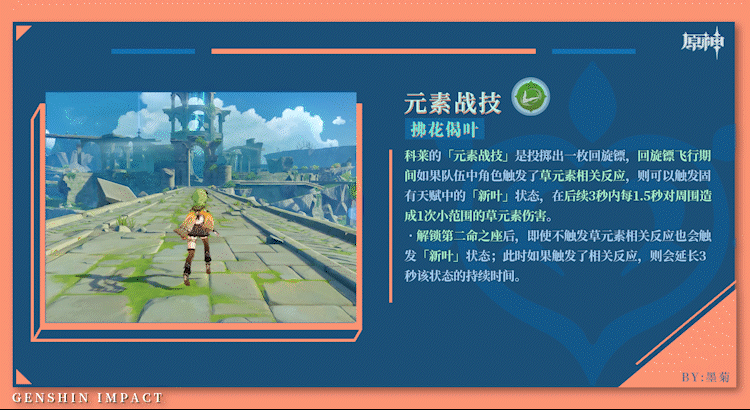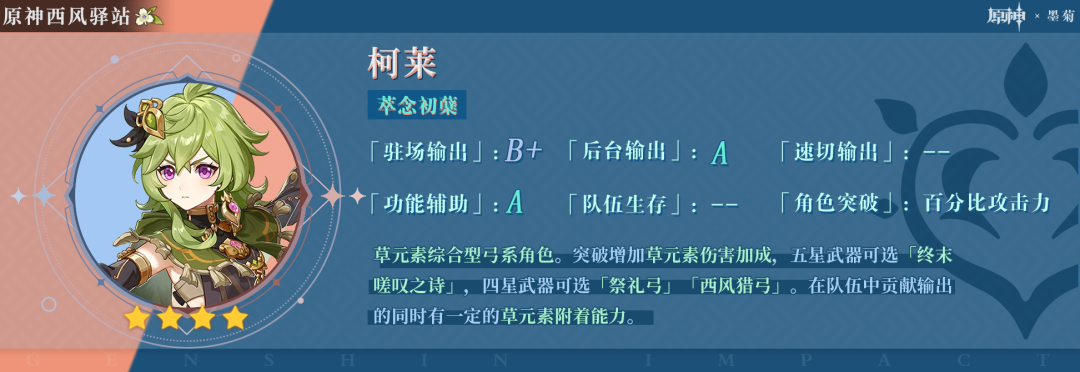 草元素弓系综合型角色。距离上一次up,柯莱依然没有太多玩法上的变动,还是可以参考V3.0时提纳里UP的描述。不过有一点需要注意,柯莱作为四星草元素输出角色,有可以佩戴「终末嗟叹之诗」的优势,因此在一些队伍中她可以成为没有纳西妲时的下位替代。
