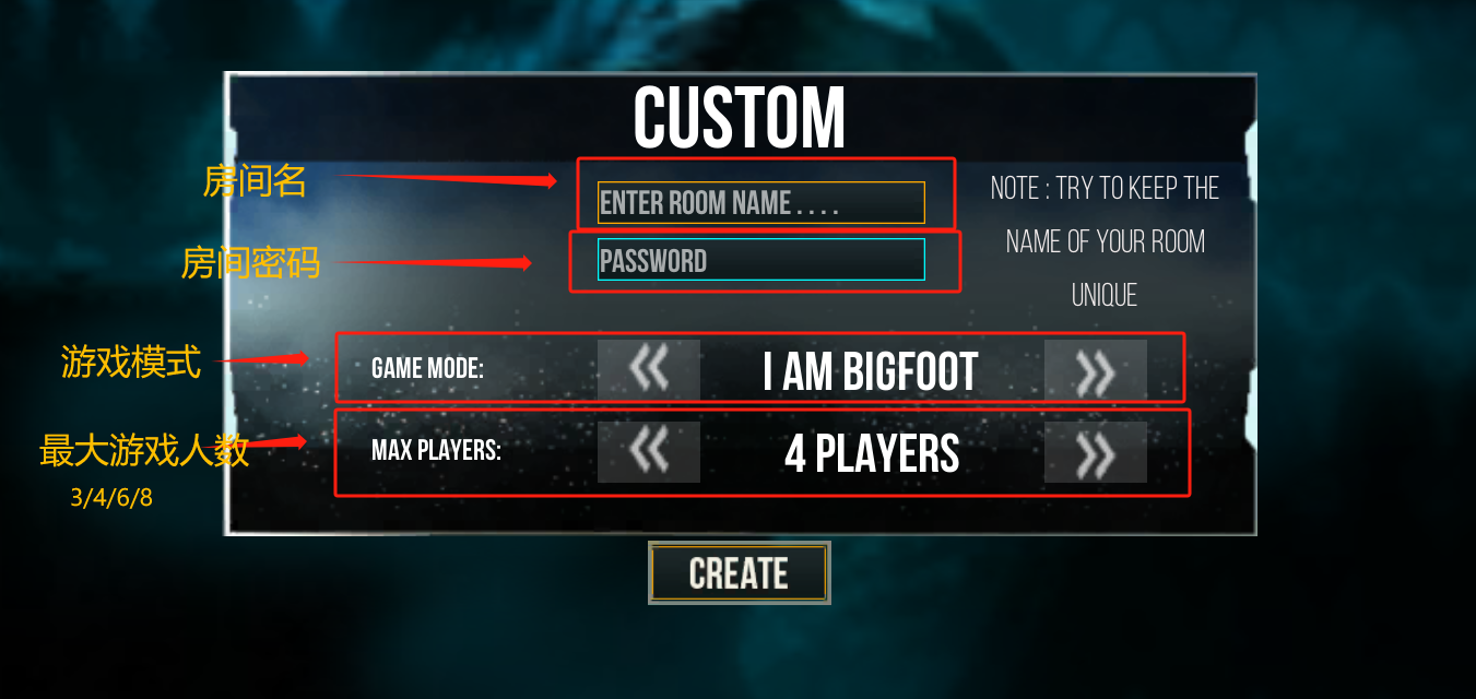 ④分别在房间选项中填入【房间名(最好是独一无二的,否则会搜到别人房间)】、【房间密码】、【游戏模式(组队模式/大脚怪模式)】、【房间最大人数(3/4/6/8)】