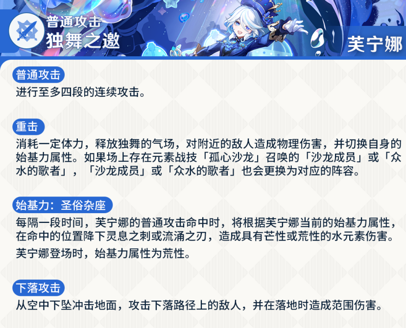 解析:芙宁娜普攻共四段伤害,主要作用是触发芒性或荒性的伤害,用于触发机关或消除增益。芙芙登场时为荒性,通过重击切换荒芒属性。