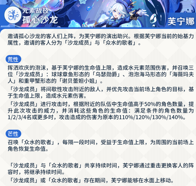 解析:元素战技是芙宁娜的核心启动机制,其效果需要根据荒芒属性的不同来区分看待。