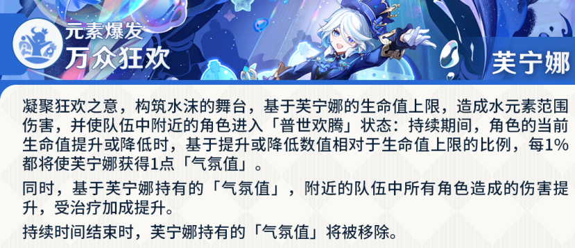 解析:芙宁娜的核心辅助机制,在大招期间为全队提供增伤和治疗加成。