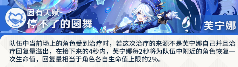 解析:当来源非芙宁娜的治疗溢出时,芙芙会给两次额外的治疗。这个天赋主要对枫丹角色比较有用,比如那维莱特的自回血可以比较频繁地触发这个天赋。