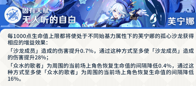 芙宁娜是生命值倍率角色,其主要技能天赋均为生命值倍率。突破加成为19.2%暴击率,符合一般五星角色模板。
