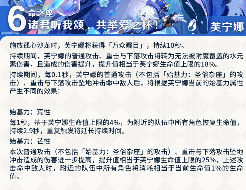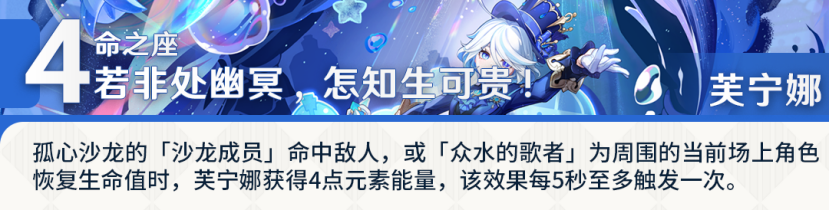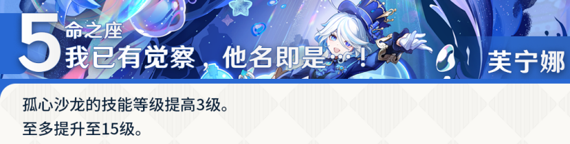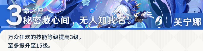 解析:叠层速度大幅提升,进一步提高芙宁娜的增伤覆盖率,使得芙宁娜进入老体系队伍也有不错的提升,溢出的层数还可以提升芙芙的生命上限,大幅提高芙芙的输出能力,非常推荐,属于质变命座。